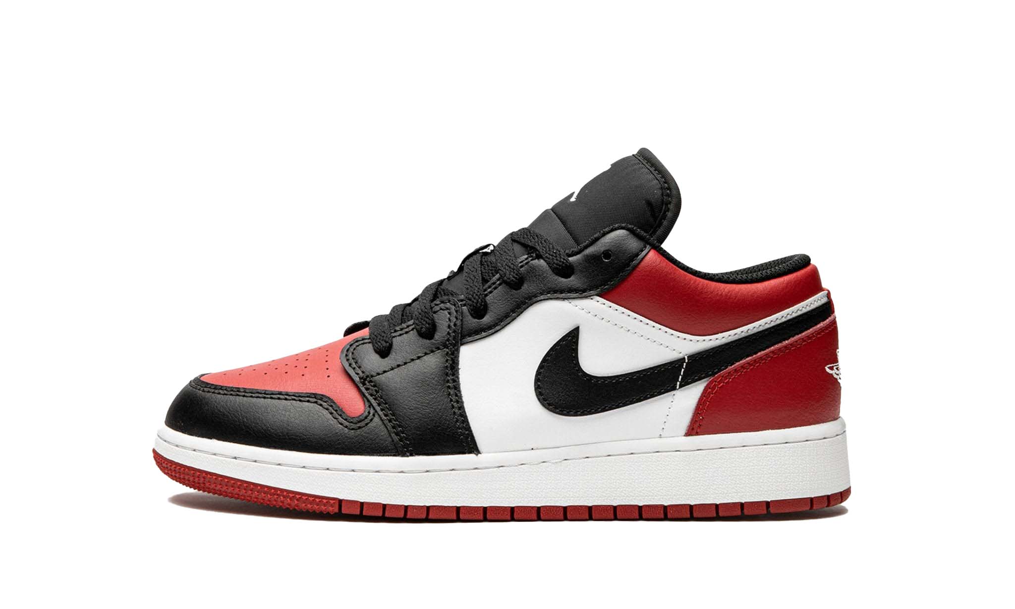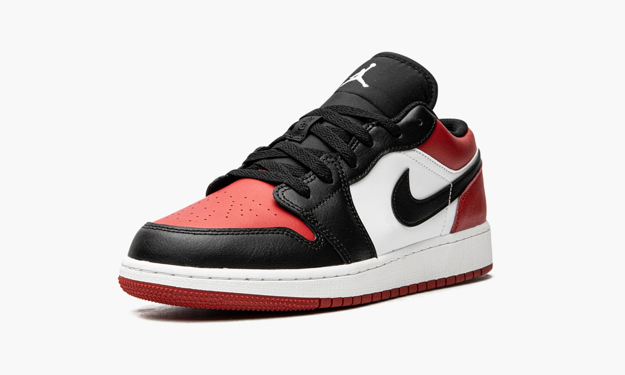 The Air Jordan 1 Low GS “Bred Toe” is the youth sizing of Michael Jordan’s first signature shoe in a colorway that replicates the look of the model’s original “Black Toe” style. Designed in the black, white, and red team uniform colors of the Chicago Bulls, the NBA team Jordan played for in the ‘80s and ‘90s. Here, Gym Red leather is found on the perforated toe, collar, and heel. Contrasting black leather appears on the forefoot and eyelets. The black-and-red color block mimics the look of the white toe and black forefoot design on the Air Jordan 1’s original “Black Toe” colorway from 1985. Elsewhere, a black leather Swoosh appears on the sides and a white “Wings” logo is embroidered on the heel. A white Jumpman is found on the black nylon tongue and “23” branding appears on the lace overlay.