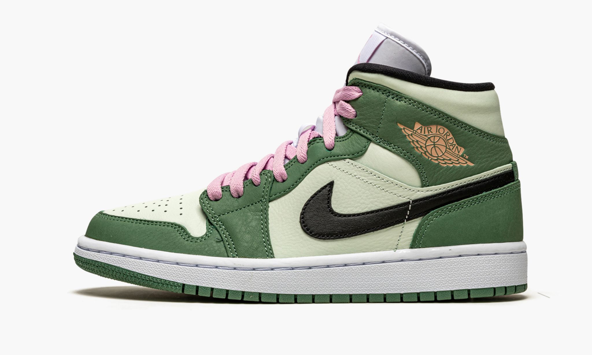 The Women’s Air Jordan 1 Mid SE “Dutch Green” is a unique look for Michael Jordan’s first signature shoe in women’s sizing. Featuring a distinctly earth tone color palette, the “Dutch Green” has a Barely Green or mint leather on the perforated toe and on the mid-panel and collar.