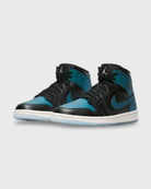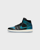 This women´s Mid Air Jordan 1 sneaker has a colorway that features black, and a multi-colored iridescent component. The black colorway covers most of the shoe, and the iridescent hue rests on the front and the back of the shoe. The midsole and a Jumpman logo on the shoe’s tongue are featured in conrasting white.