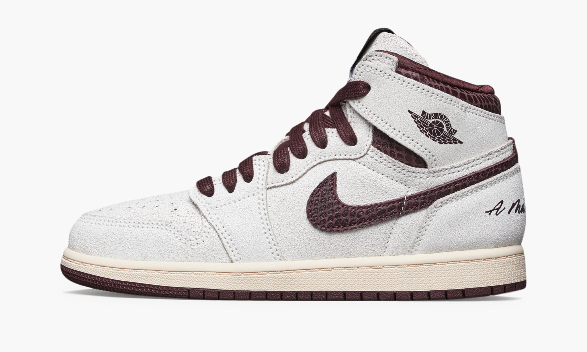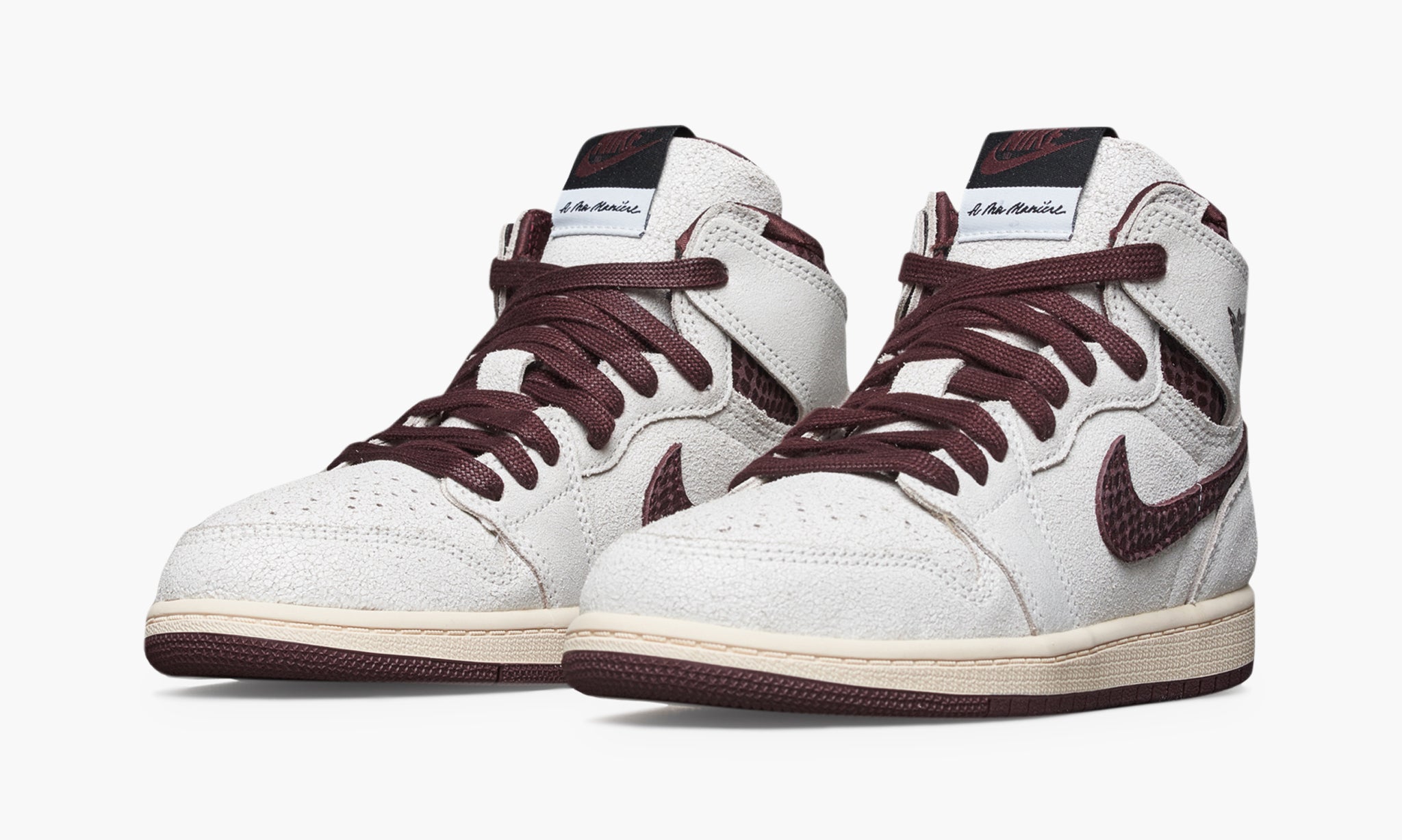 The A Ma Maniére x Air Jordan 1 High OG is a limited edition collaboration between James Whitner’s fashion boutique and Jordan Brand on Michael Jordan’s retro basketball shoe that was released in December 2021. Like A Ma Maniére’s Women’s Air Jordan 3 “Raised by Women” collaboration, one of the top sneaker releases of 2021, the boutique’s take on Jordan’s first signature shoe is awash with luxury-inspired details, including a cracked white leather upper paired with a burgundy quilted interior lining. A burgundy snakeskin-covered Swoosh appears on either side of the shoe and a “Wings” logo is found on the collar. Dual “Nike Air” and “A Ma Maniére” detailing appears on the top of the cracked leather tongue with burgundy laces. Subtle design modifications by A Ma Maniére to the Air Jordan 1 include the phrase “You have to expect things for yourself before you can do them,” on the inside of the flaps, and “Airness by A Ma Maniére for Air Jordan” branding on the insole. A cream rubber midsole and burgundy outsole complete luxurious the look. Release date: December 3, 2021