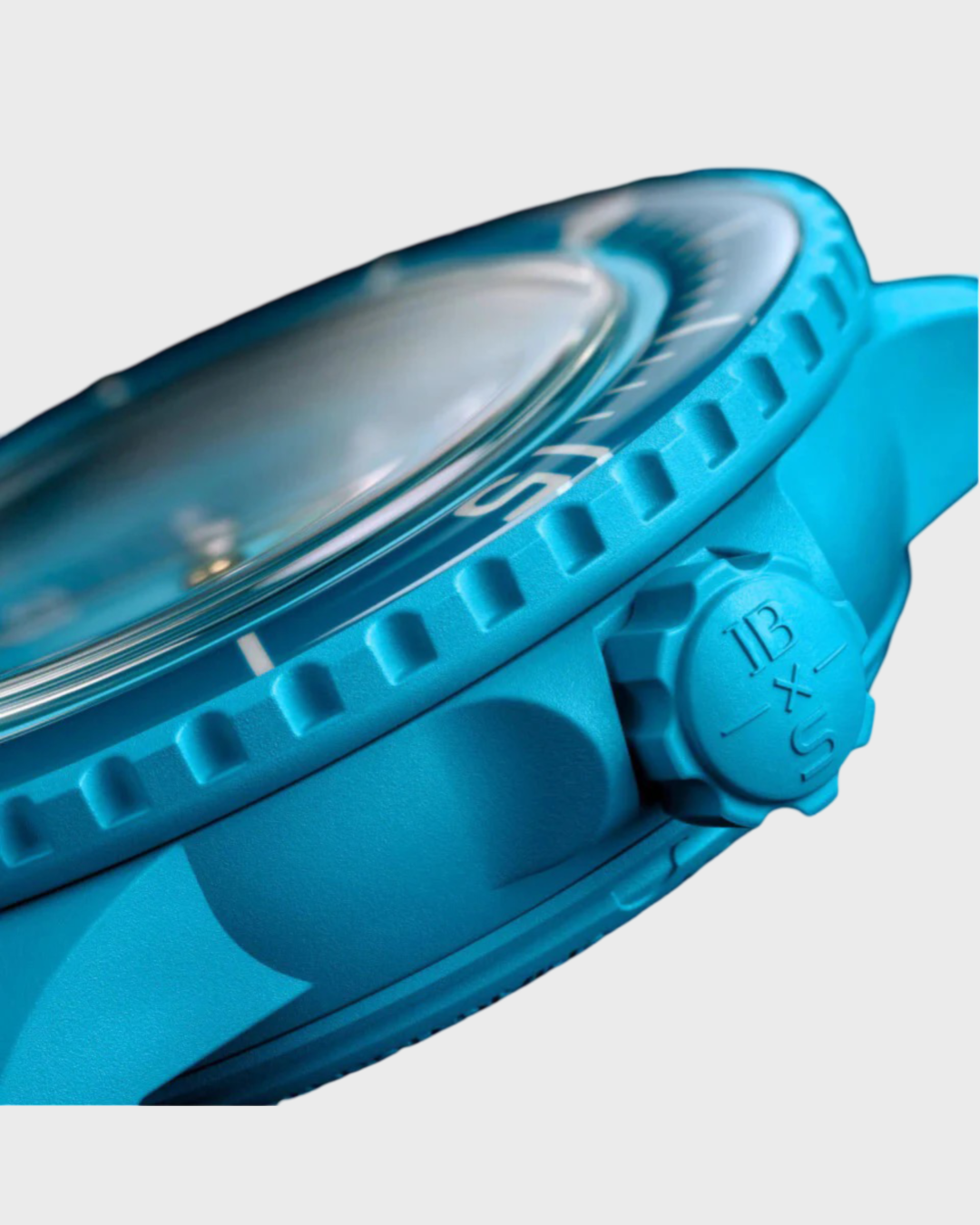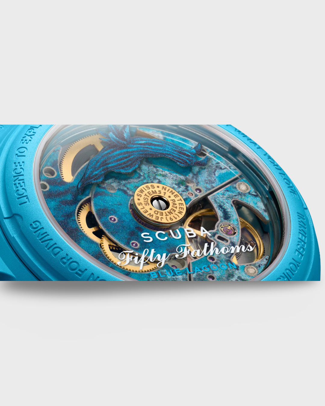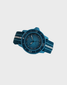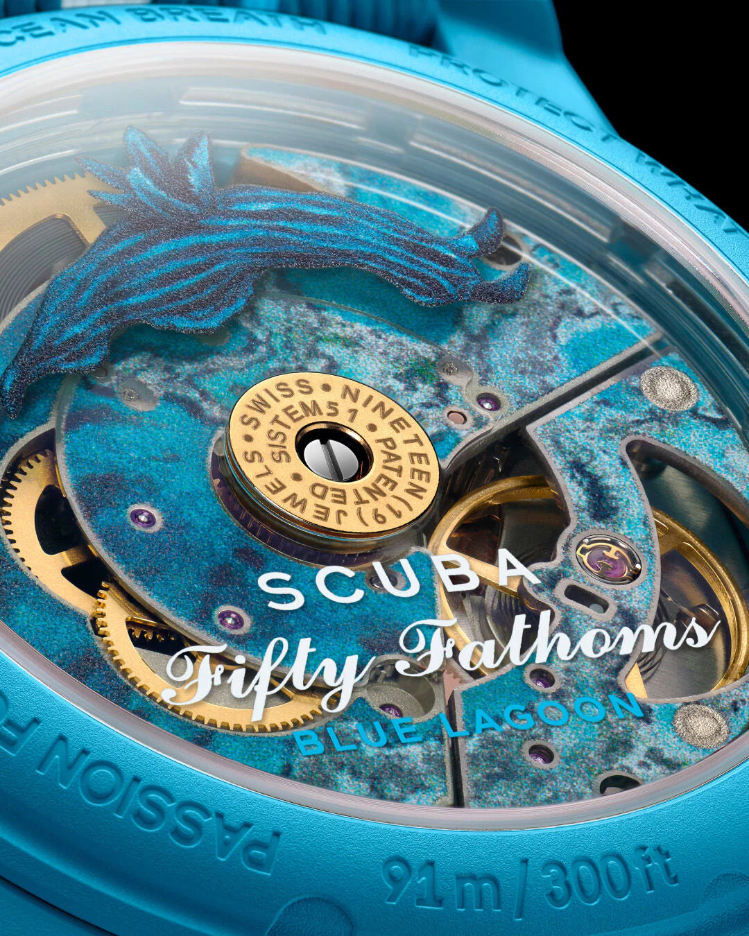 This Blancpain X Swatch watch honors Blancpain’s Fifty Fathoms, the first true diver’s watch. Its turquoise-blue case and crown are made of Bioceramic material. The word “Swatch” is inscribed on the outer left side of the case. The dial has a sun-brushed finish and features a date indicator between 4 and 5 o'clock. The hour indexes, hour, and minute hands, the tip of the seconds hand as well as the scale on the bezel, are enriched with Grade A Super-LumiNova® for outstanding legibility in the dark. The watch features a dark blue unidirectional Bioceramic bezel and biosourced glass. The SISTEM51 mechanical movement is visible through a transparent sapphire glass caseback and features an illustration of a lagoon and the Tambja Mullineri nudibranch in digital print. Five inspirational inscriptions can be found on the back of the watch: PASSION FOR DIVING – LICENCE TO EXPLORE – OCEAN BREATH – PROTECT WHAT YOU LOVE and IMMERSE YOURSELF. The two-piece NATO-style strap is made from recycled fishing nets and provides full visibility of the movement. The pin buckle and loops are made of Bioceramic material.