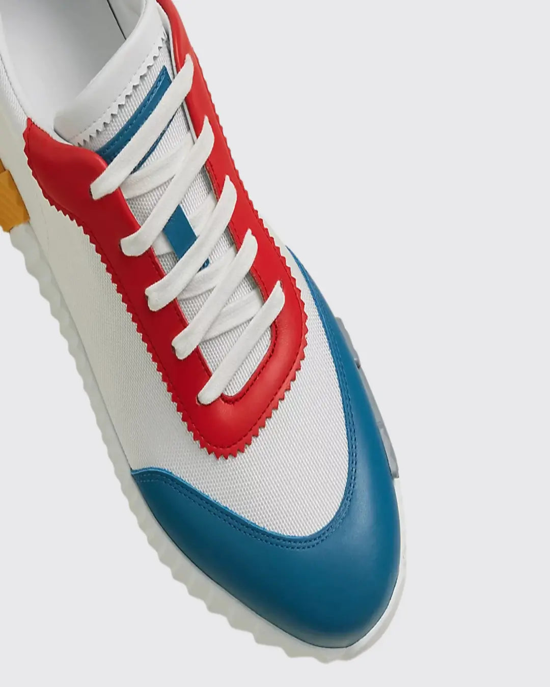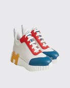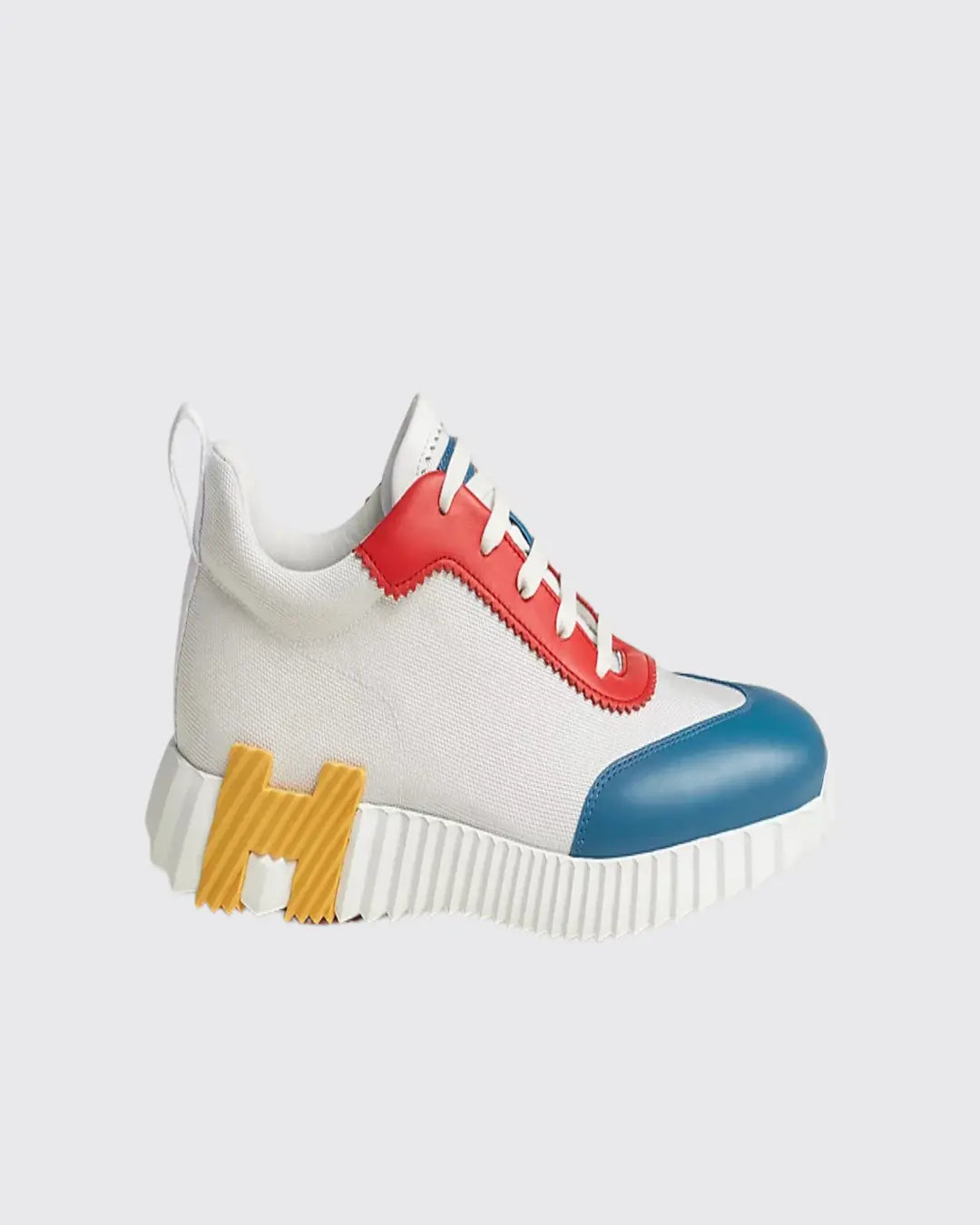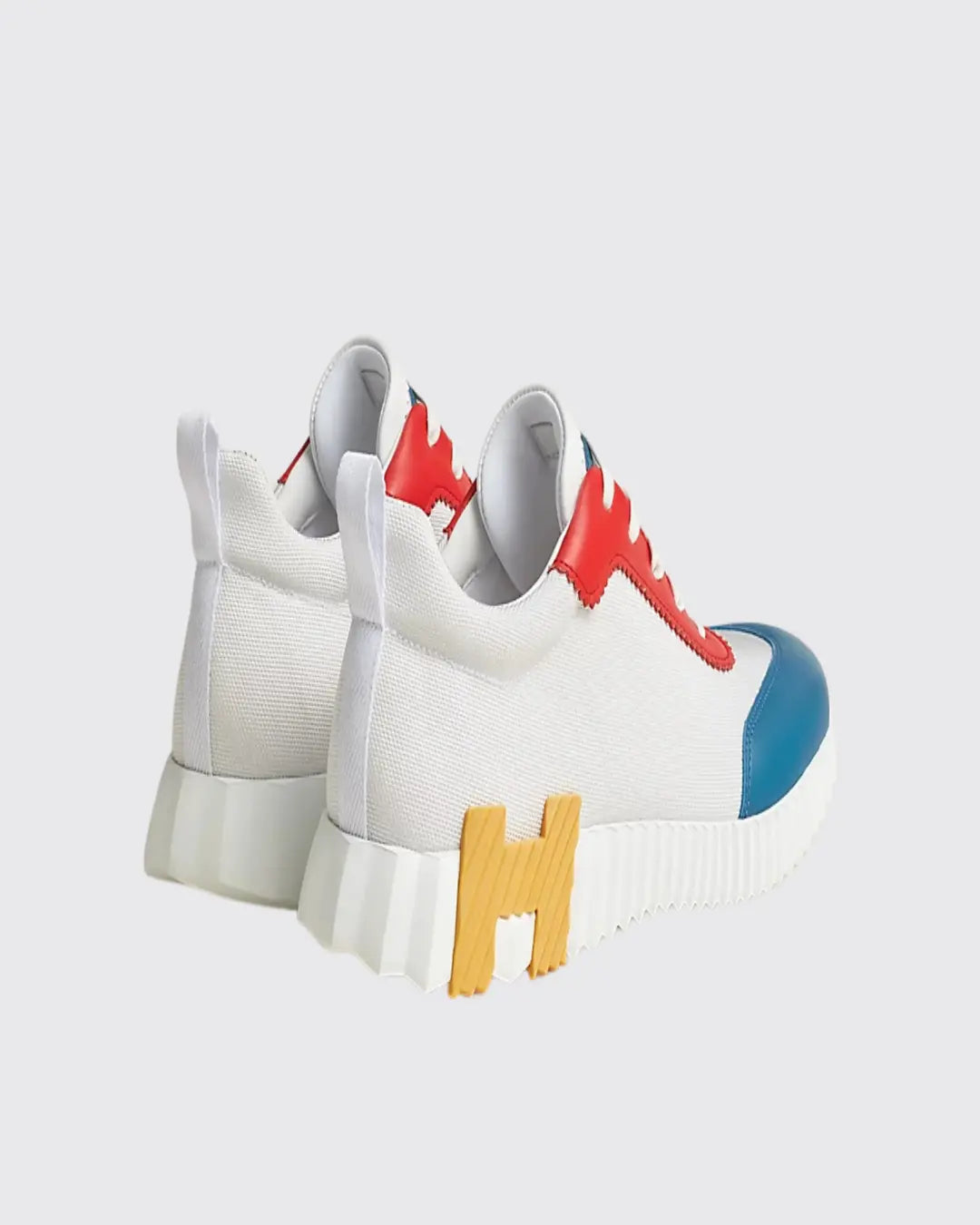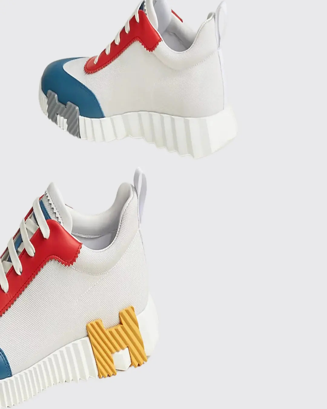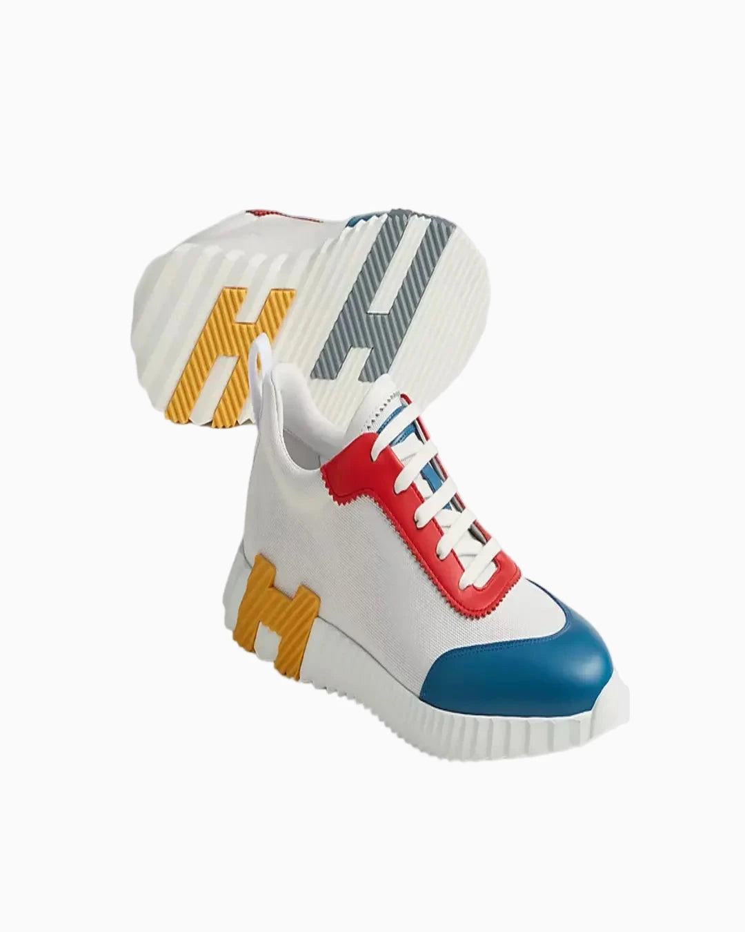 Showing a clean pair of heels, the Bouncing sneaker ventures into urban effervescence. So light that it no longer appears to touch the ground and full of untamed energy, it turns every moment into a high-speed adventure. Thinking big, it features a signature "H en biais" motif in a bold, oversized format.