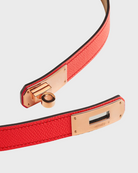 The Hermès Kelly 18mm Belt in Gold Terre Battue is a luxurious accessory featuring high-quality Epsom calfskin leather and a Gold Kelly buckle. It is known for its adjustable size (60 cm to 100 cm), making it versatile for wearing at the waist or hips. The belt also includes rose gold-plated hardware for a refined finish and comes with a full set.