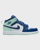 The Air Jordan 1 Mid Blue Mint (GS) features a blue and white color combination. The blue is accented with Metallic Silver from the TPU midsole and heel counter, while the Nike Air logo is executed in Electrolime at the tongue. The midsole is fitted with deep flex grooves and has a blend of a white rubber outsole.