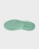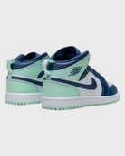 The Air Jordan 1 Mid Blue Mint (Gradeschool) features a leather upper, with stitched and overlays an Air-Sole unit, heel Air unit, and an outsole with a herringbone traction pattern.