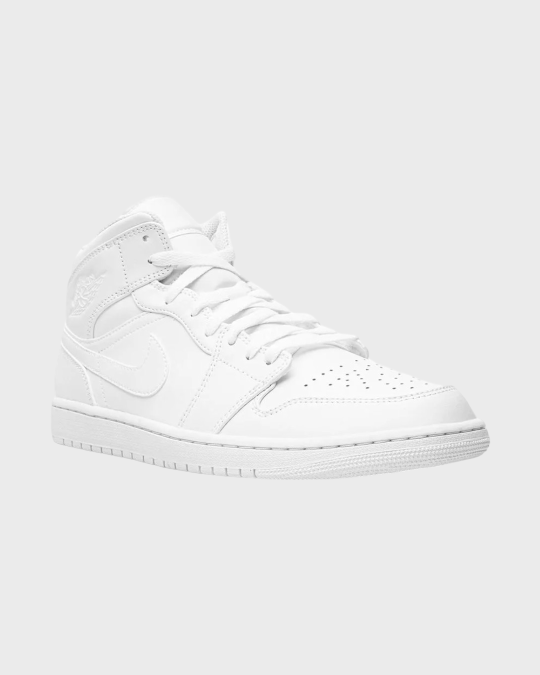 The Mid Triple White Jordan 1 embraces a timeless design, characterized by a white leather upper. Incorporated within the midsole is Nike Air cushioning technology, providing a comfortable experience while effectively absorbing shocks. The outsole is crafted from sturdy rubber, delivering reliable traction and stability. Notable features of the shoe include the iconic Nike Swoosh displayed on the sides and a subtle Air Jordan Wings logo on the collar.