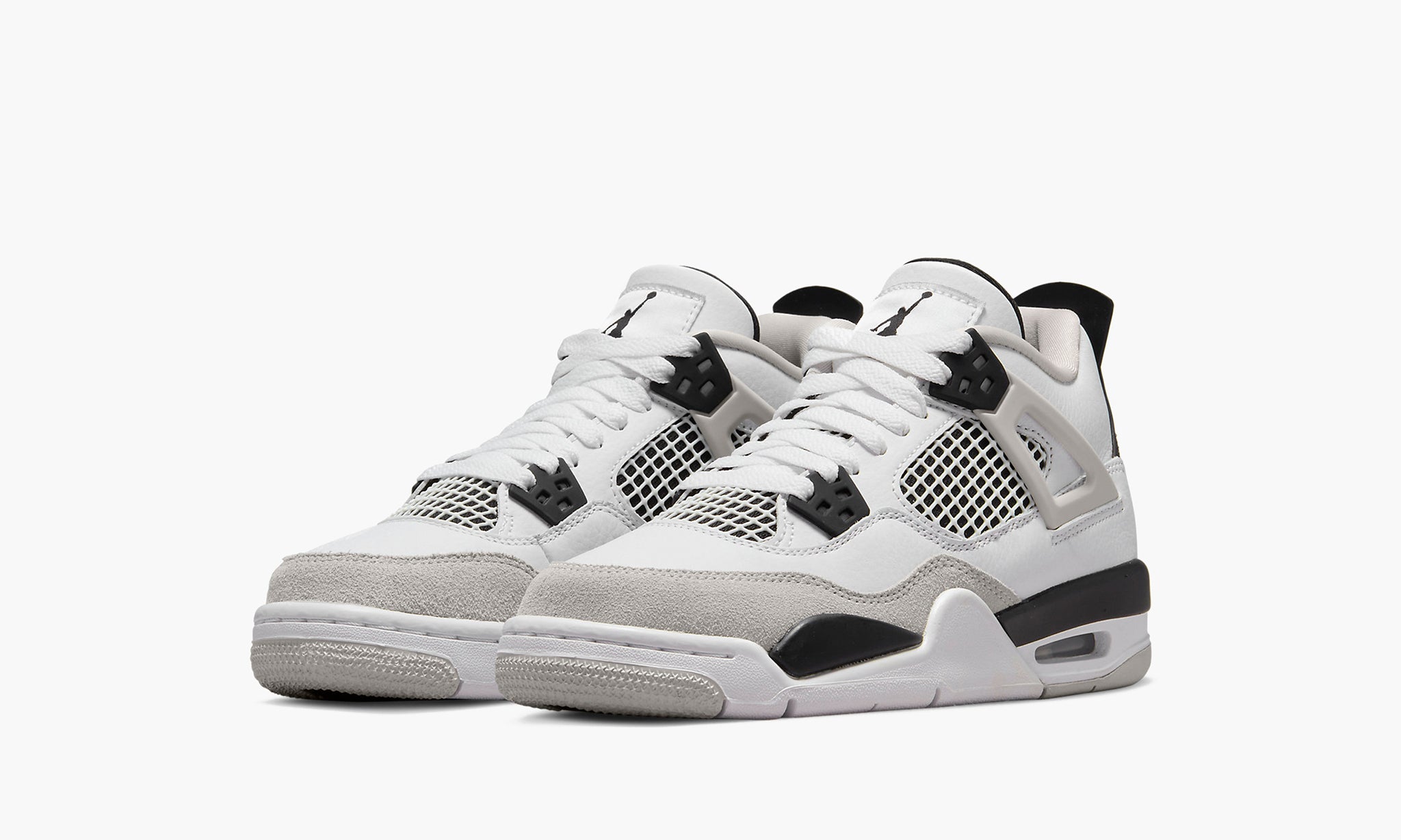 The Air Jordan 1 GS “Military Black” is the youth sizing of the colorway of Michael Jordan’s fourth signature shoe that replicates the color block of the model’s popular, original “Military Blue” style from 1989. The Jordan 4 GS “Military Black” is inspired by the Jordan 4 “Military Blue” as it features the same color design as the old school colorway, just with black accents instead of blue. The shoe’s upper is constructed with a white leather base with grey suede on the forefoot overlay. The TPU eyelets and heel counter are accented in black. As are the underlays beneath the netting on the sides and on the tongue. Classic Jumpman logo detailing can be found on the heel and on the tongue tag. Release date: May 21, 2022