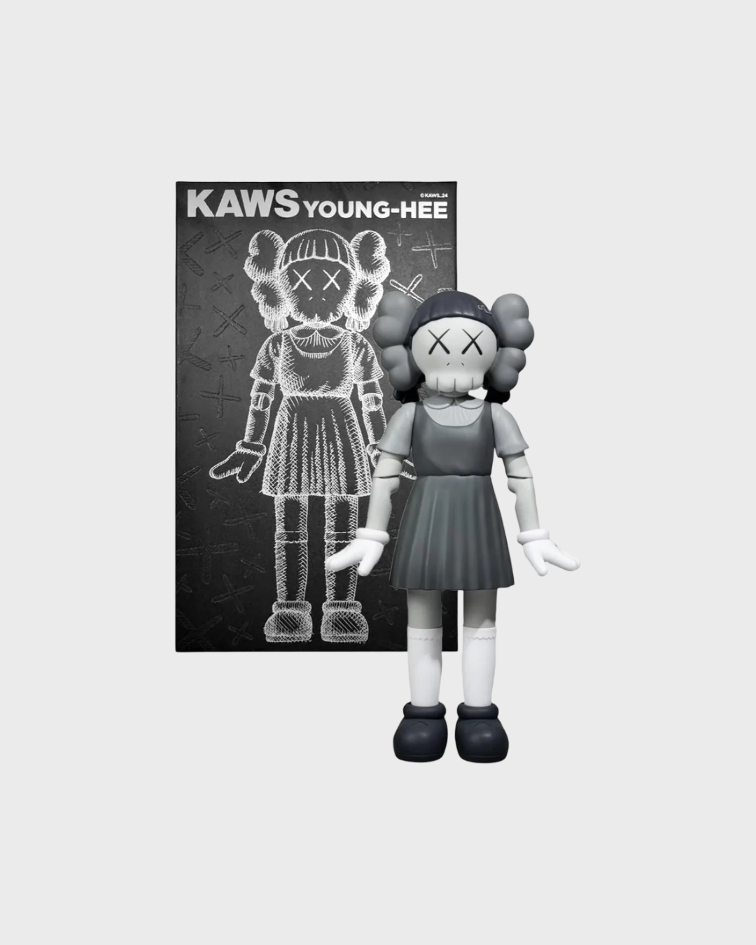 KAWS brings his signature artistry to one of pop culture’s most iconic characters with the Squid Game Young-Hee Vinyl Figure – Monotone Edition. This reimagining of the eerie yet unforgettable doll from Netflix’s Squid Game is rendered in a sleek grayscale palette, blending minimalist style with bold design.