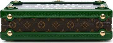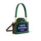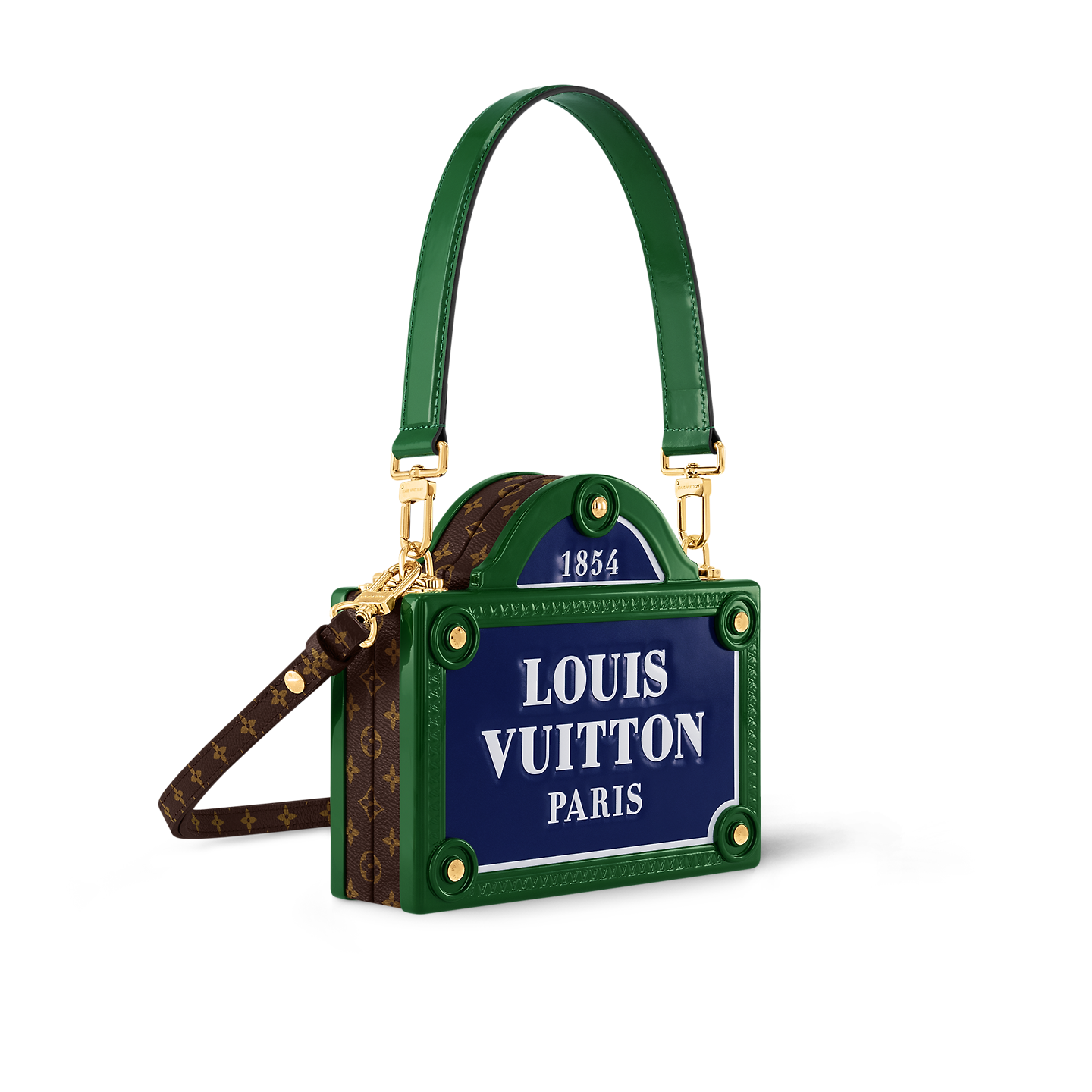 Nicolas Ghesquière puts Paris in the spotlight with this Petite Malle handbag reworked with a pediment to resemble a Parisian street-sign. Inside the green frame, decorated with gold-color rivets, is a bold “Louis Vuitton Paris” in white lettering on a blue background. The Petite Malle has a removable gold-color chain and an adjustable strap, also detachable.