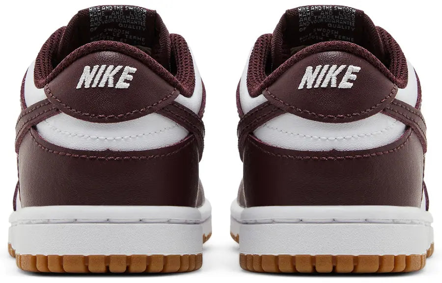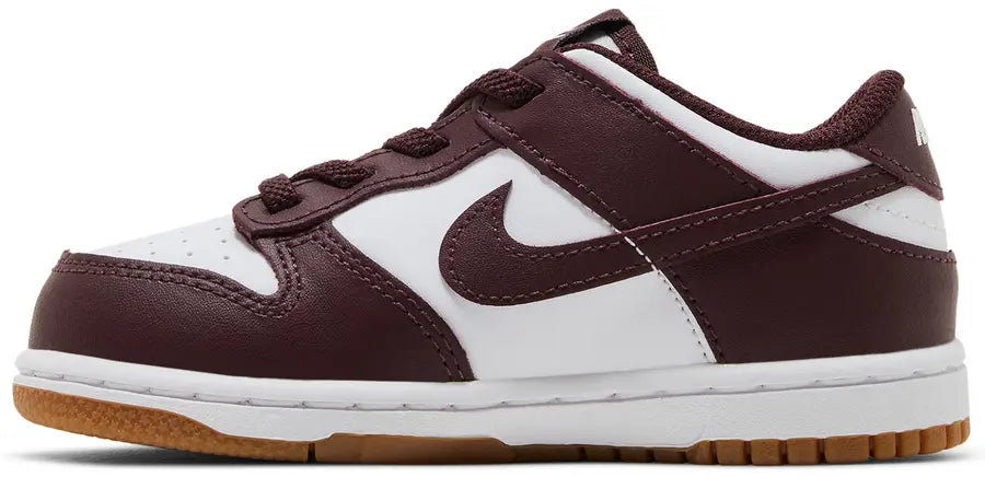 The Nike Dunk Low Burgundy Crush Gum is a stylish addition to Nike's Dunk lineup, designed specifically for kids. Available in Toddler (TD) and Preschool (PS) sizes, it features a clean and versatile aesthetic: