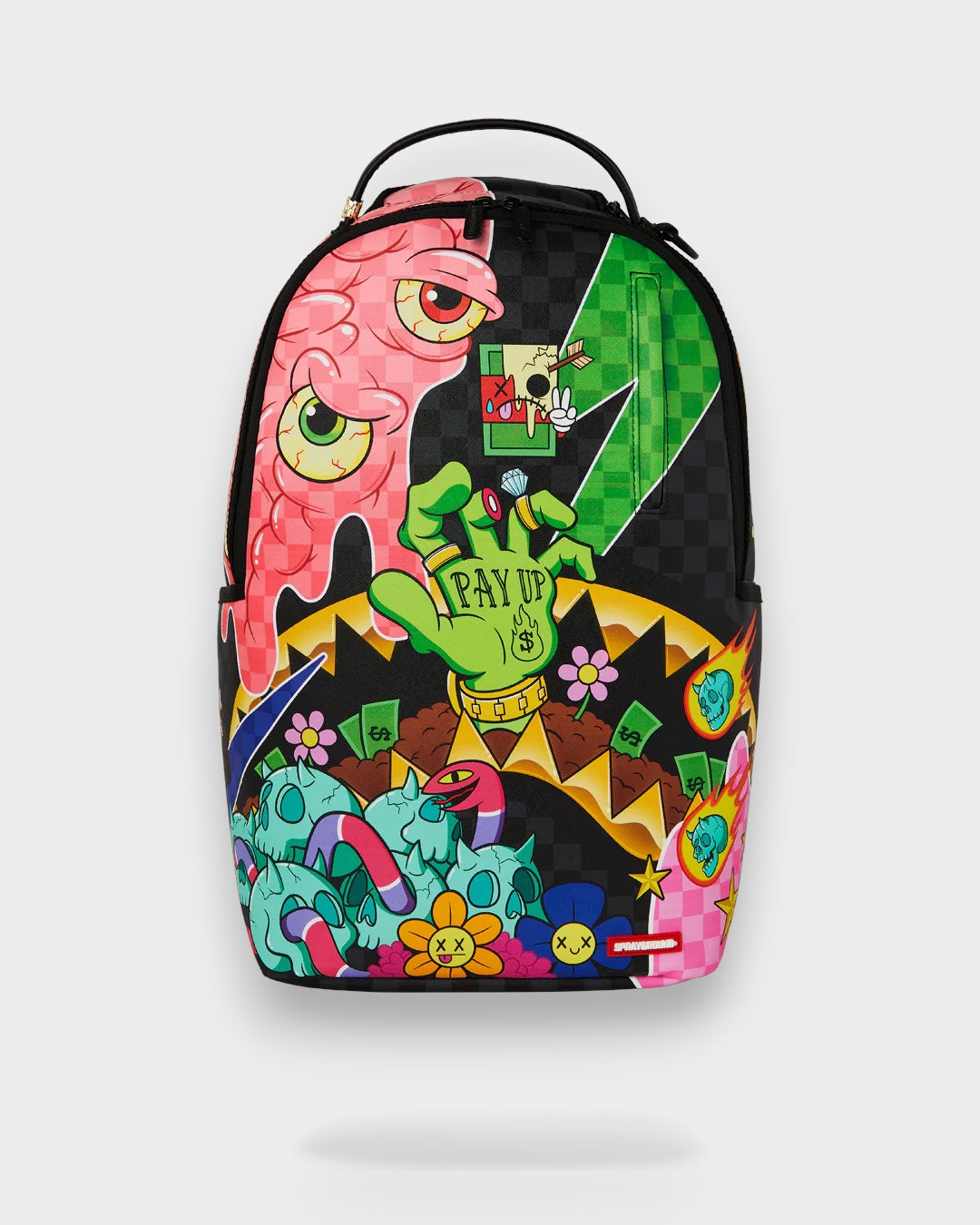 Dimensions: 18" x 6" x 11.5" • Front zipper pocket • Side pockets • Zippered Stash pocket • Separate velour sunglass compartment • Ergonomic mesh back padding • Adjustable Straps for custom sizing • Gold zippers with metal hardware • Metal "Sprayground Authentic" badge • Slide through back sleeve connects to carry-on luggage to free your hands