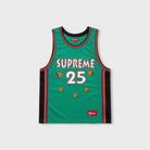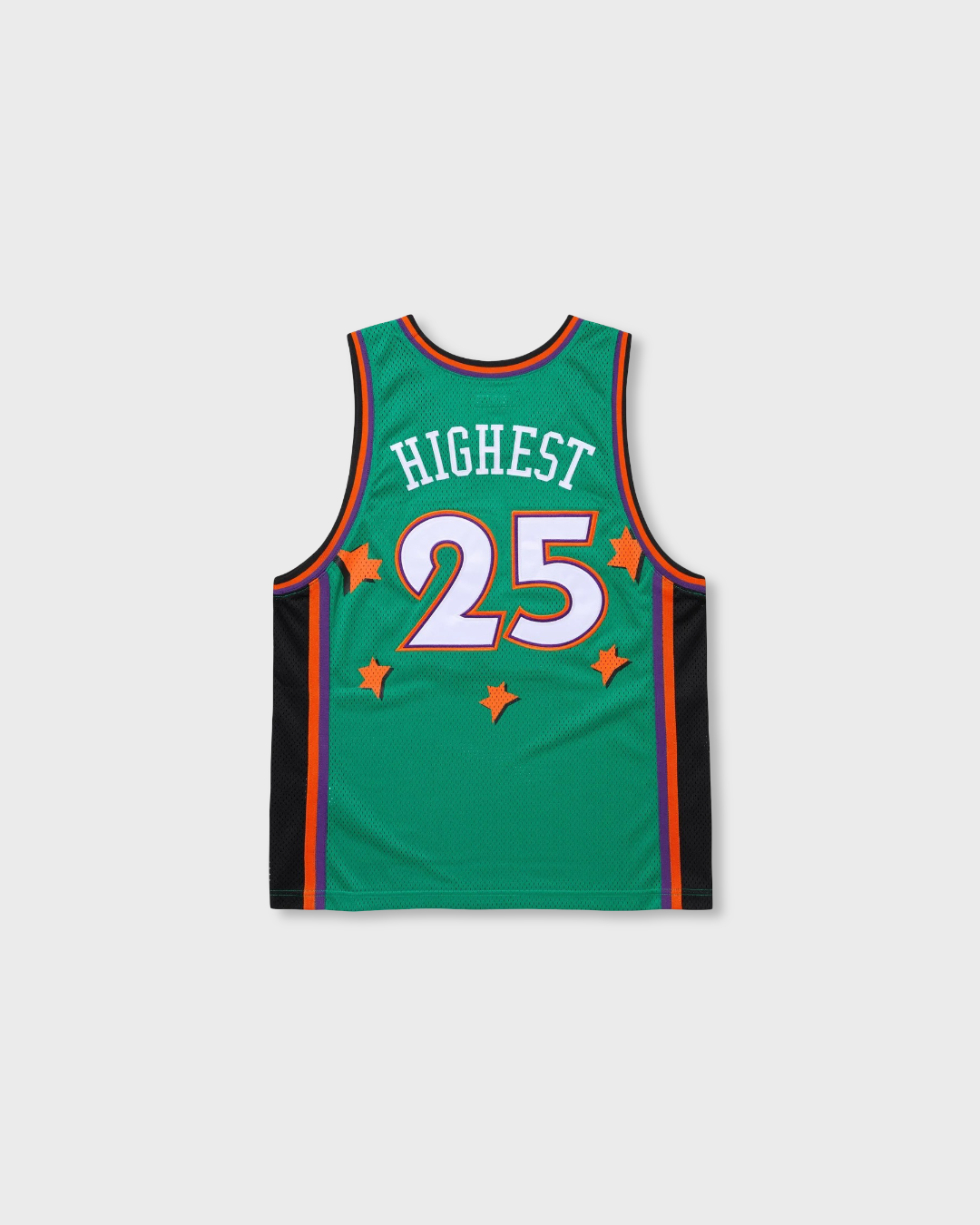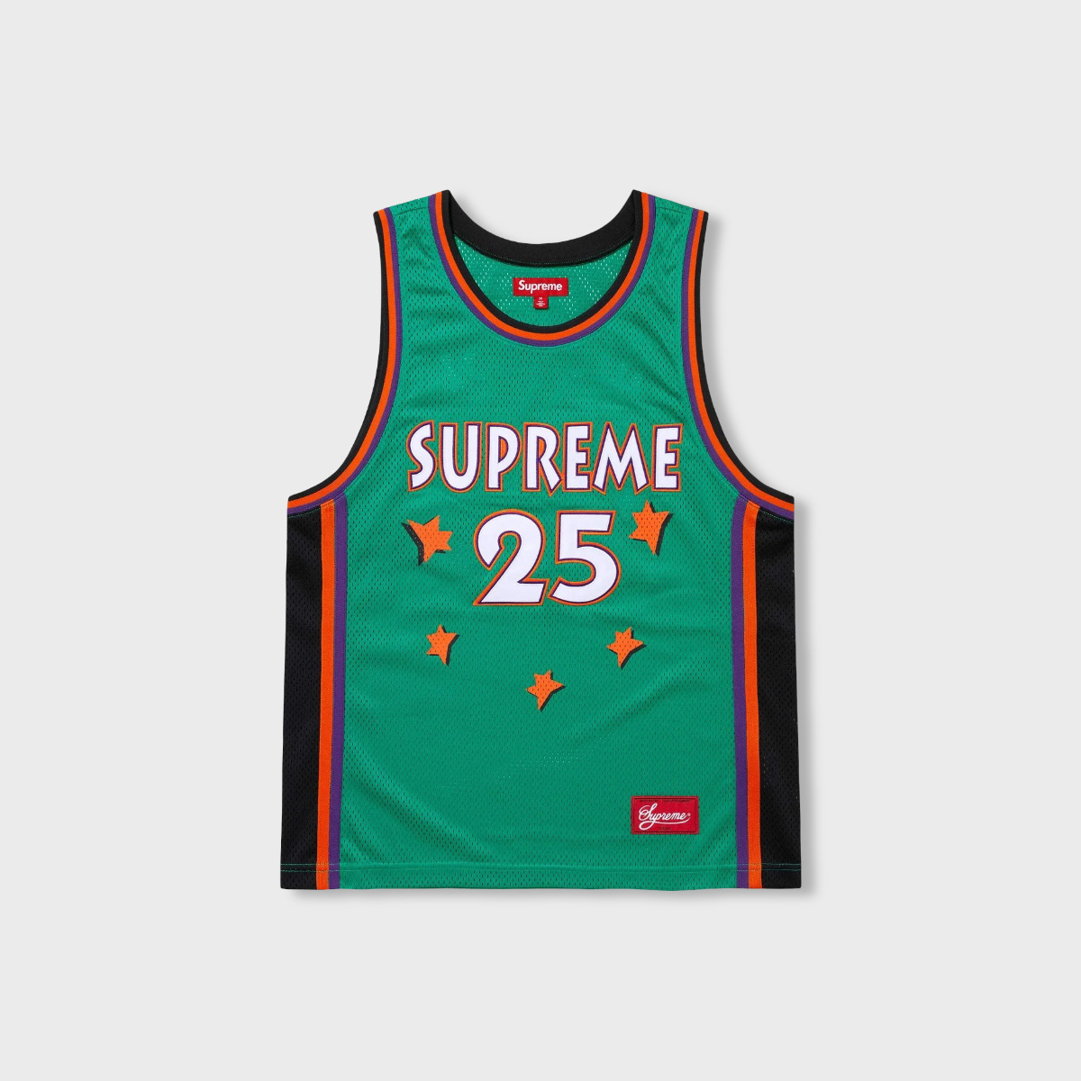 Poly eyelet mesh jersey with knit taping at sides. Tackle twill appliqué with printed graphic at front and back. Athletic label at lower front.