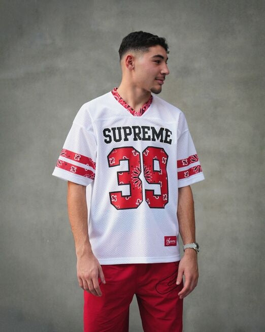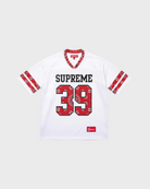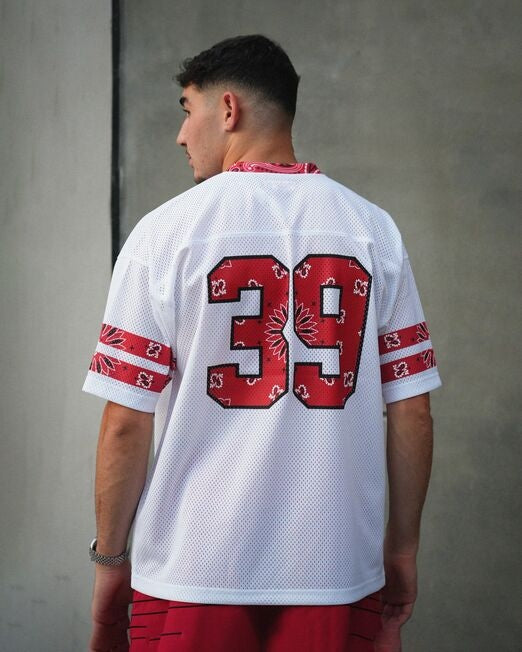 Poly eyelet mesh jersey with printed graphic and logo on front and back. Athletic label at lower front.