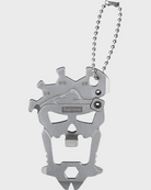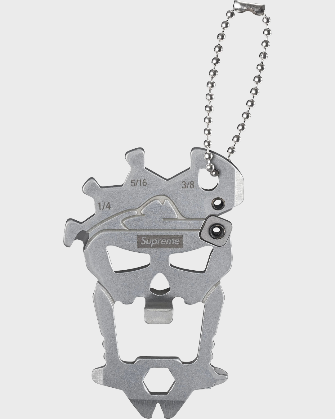 Compact stainless steel multi-tool. Includes pry bar; bottle opener; small and large flathead driver; small Phillips driver; line cutter; blade sharpener; 1/4", 5/16" and 3/8" wrench; 1/4" hex bit driver. Laser engraved logo on front. Hole for keychain carry. 2.5" x 1.5" x 0.05". Made exclusively for Supreme.
