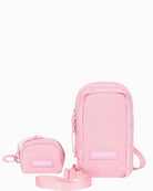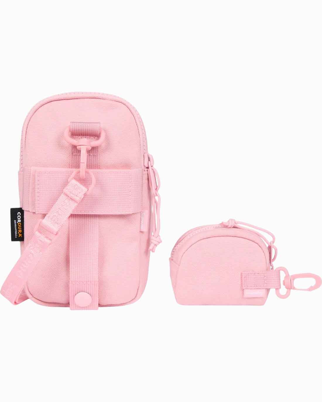 Water resistant Cordura® cotton blend canvas with embossed logo lining. Main zip compartment and additional front zip pocket. Jacquard logo webbing adjustable neck strap. Webbing velcro and snap tab closures at back. Woven logo label at front. Removable mini pouch with zip closure and woven logo label. Sold as a set. 7.1" x 4.3" x 2". 1.5L.