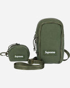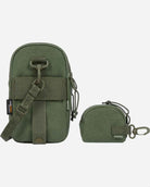 Water resistant Cordura® cotton blend canvas with embossed logo lining. Main zip compartment and additional front zip pocket. Jacquard logo webbing adjustable neck strap. Webbing velcro and snap tab closures at back. Woven logo label at front. Removable mini pouch with zip closure and woven logo label. Sold as a set. 7.1" x 4.3" x 2". 1.5L.