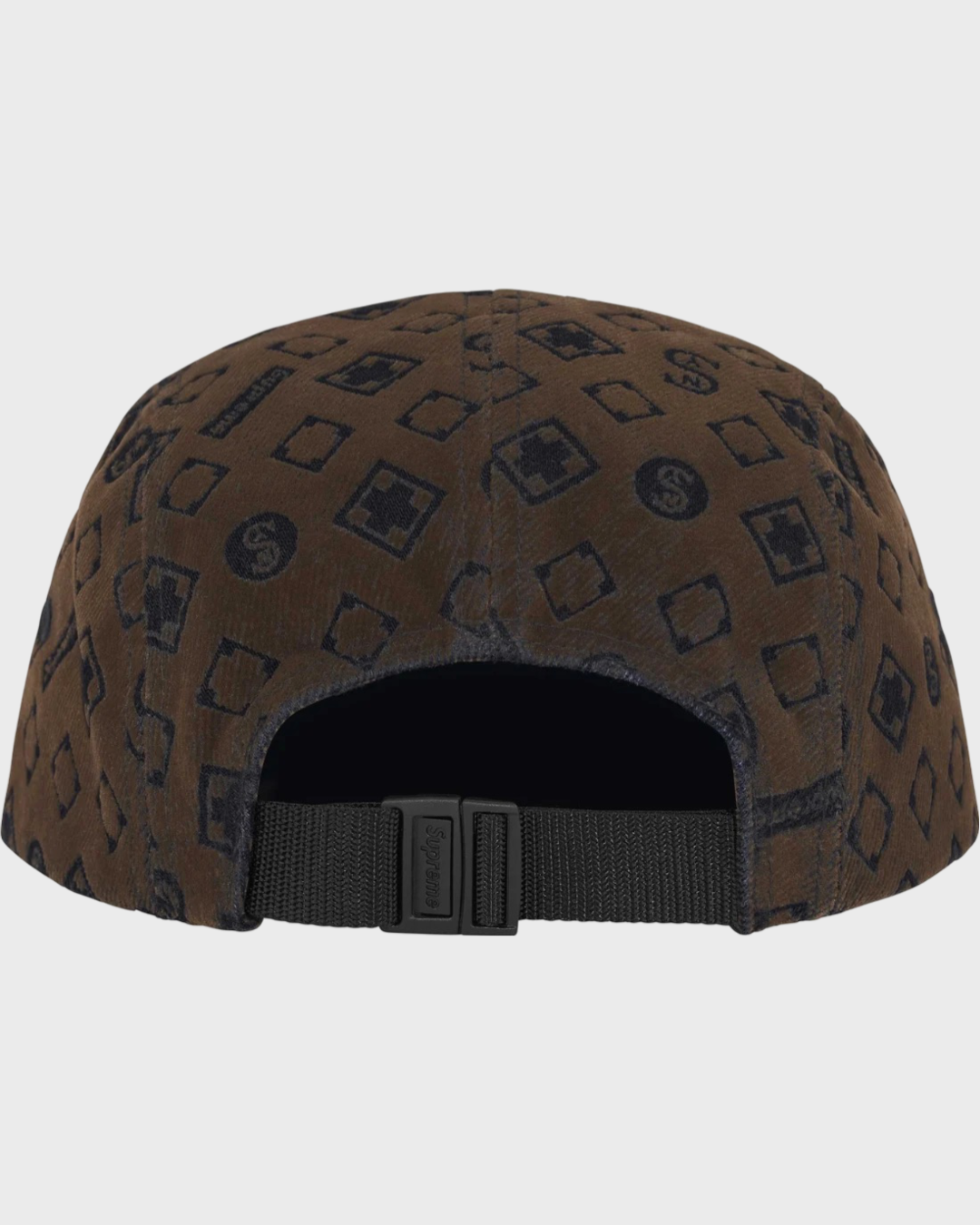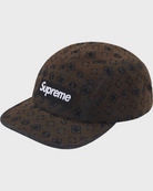 All cotton 13 oz. denim Supreme camp cap with flocked logo pattern.