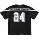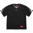 Poly eyelet mesh and dazzle with embroidered logo on chest. Jacquard knit logo rib and tackle twill graphic appliqué at back. Athletic label at lower front.