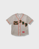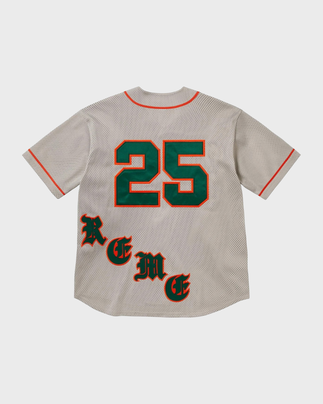 Poly eyelet mesh jersey with button front closure. Tackle twill appliqué at front and back. Athletic label at lower front