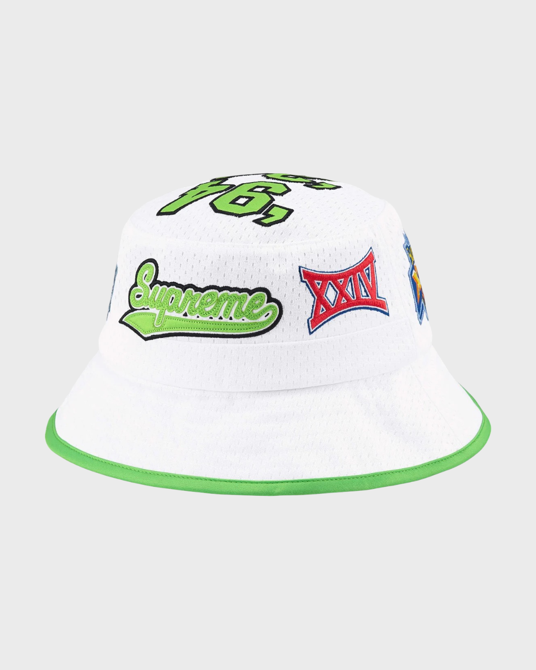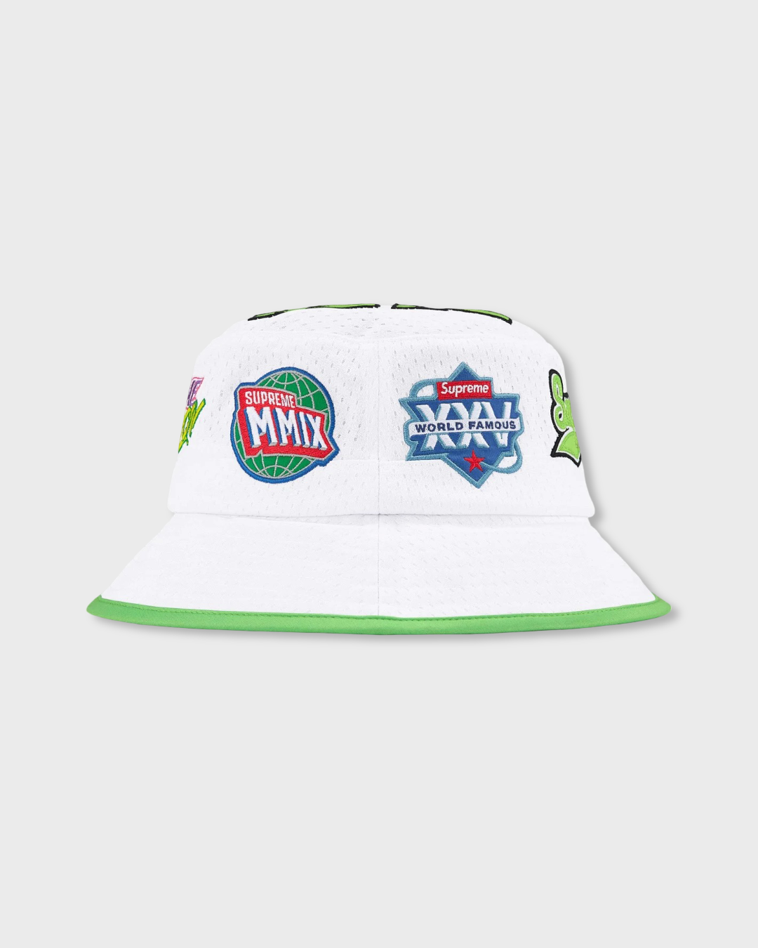 Poly eyelet mesh crusher with tricot lining. Tackle twill appliqué and embroidered graphics throughout.