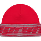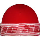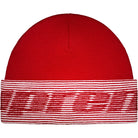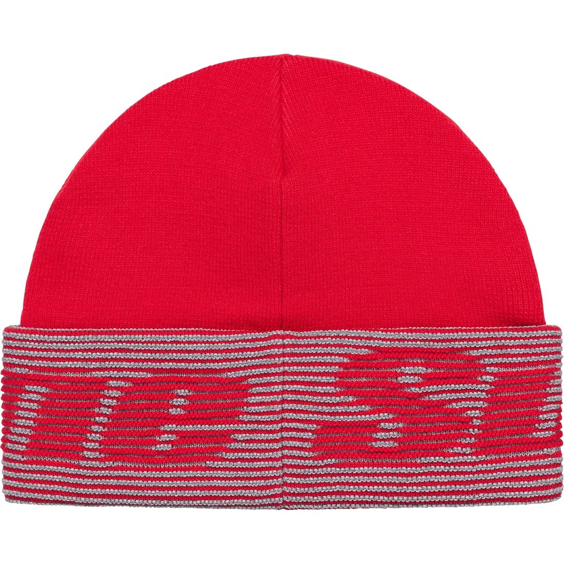 Acrylic cuffed beanie with reflective jacquard knit logo at cuff.