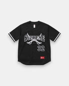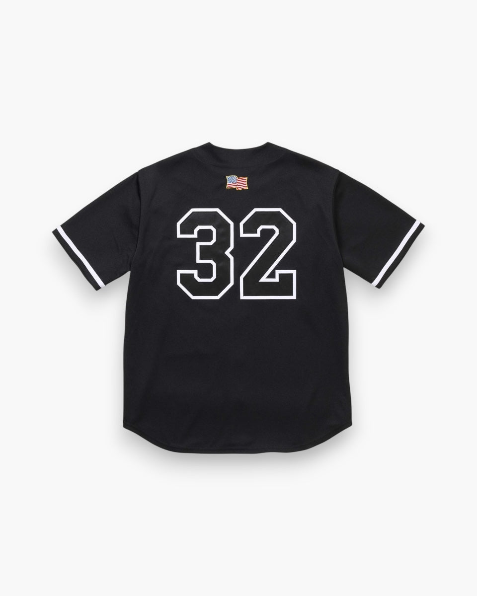 Poly sand knit with button front closure. Tackle twill appliqué at front and back. Embroidered patch at back neck and athletic label at lower front.