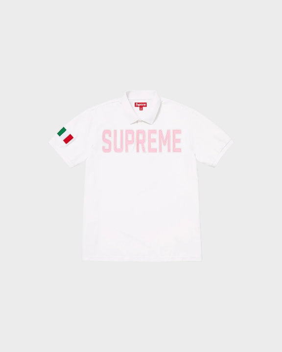 All cotton pique polo with two-button placket. Cotton twill appliqué at chest and felt patch at sleeve.