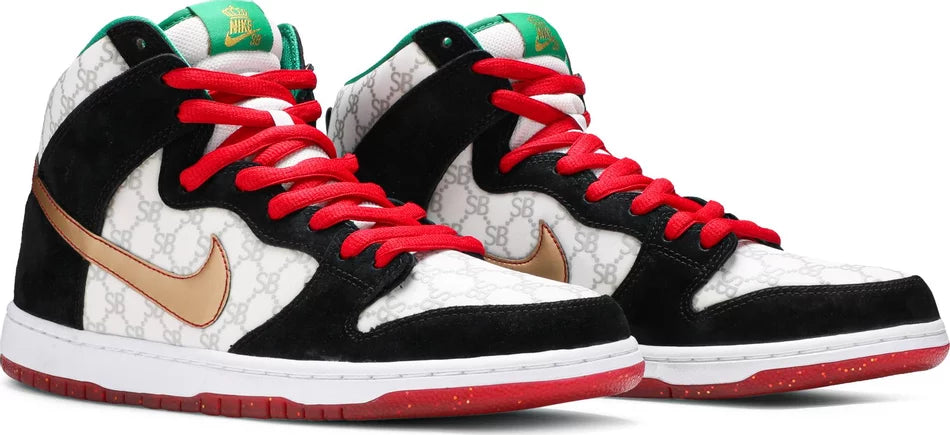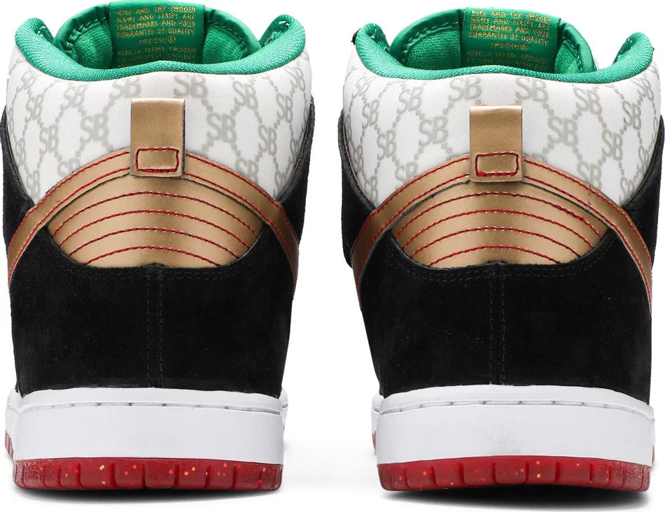 The Black Sheep x Nike Dunk High SB 'Paid In Full' pays tribute to the critically acclaimed Rakim and Eric B. song. Canceled immediately after it was unveiled, the sneaker references the bespoke Dapper Dan jackets worn by the hip-hop legends on the cover of the title album with an interlocking 'SB' monogram. Metallic Gold Swooshes and thick laces represent their signature dookie rope chains, while the green interior and tongue patch symbolize the dollar bill background.