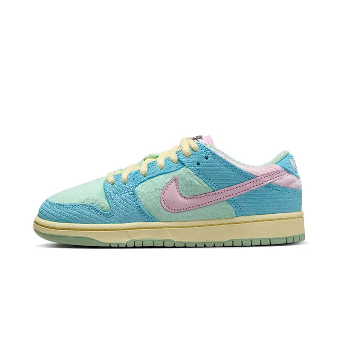 The Nike SB Dunk Low Verdy Visty is a fresh and playful take on the iconic SB Dunk model, brought to life through a collaboration with Japanese artist Verdy. This eye-catching sneaker takes inspiration from Verdy’s character, "VISTY," blending creativity and street style in a standout design. The color palette is a pastel dream, with blue gaze, light arctic pink, and bicycle yellow tones adding a whimsical touch to the classic silhouette.