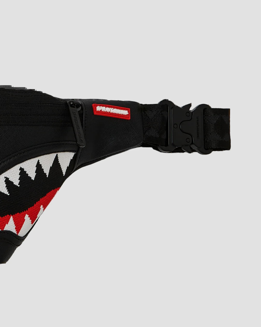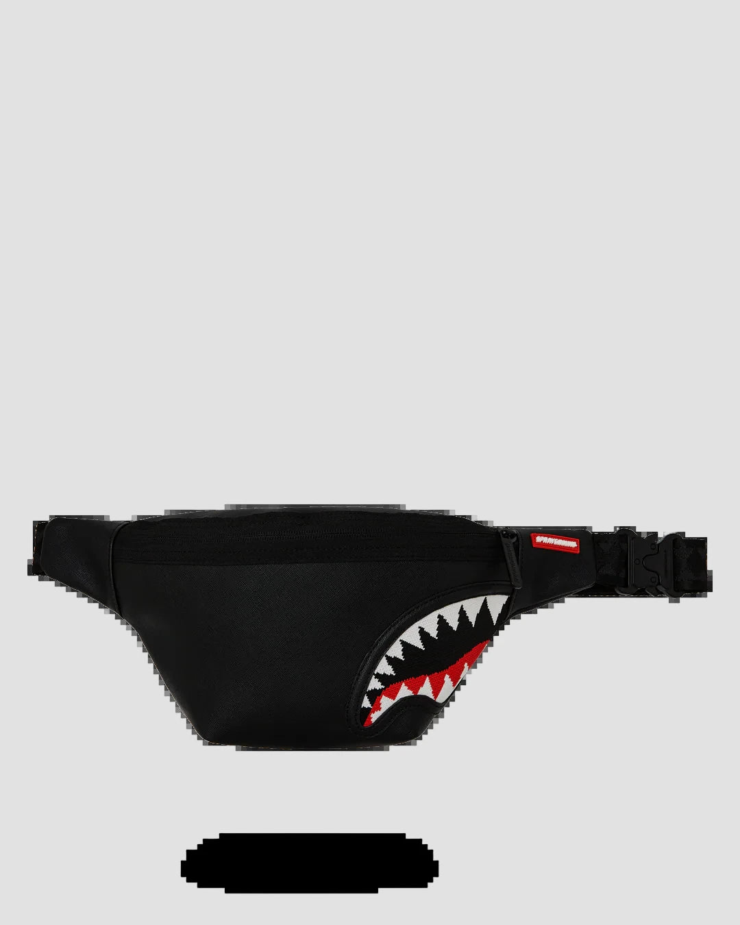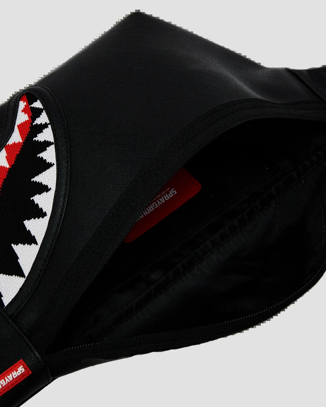 This crossbody form—known as the "Savvy Crossbody"—features Sprayground’s iconic shark-mouth graphic rendered in fly-knit texture, laid across a streamlined, wearable silhouette. The material is vegan leather (PVC-like, water-resistant), offering both durability and a fashion-forward vibe.