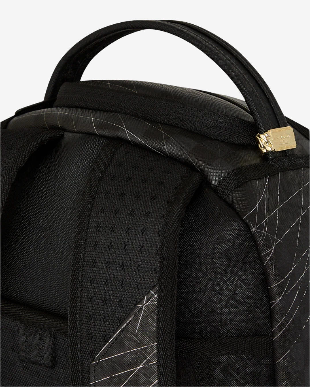 Known as the World Wide Web DLXSV or Spider Web DLXSV Backpack, this is a faux‑leather Sprayground style featuring a distinctive spider-web pattern over a classic checkerboard background, plus a gem‑encrusted spider zipper pull. Its sleek black-on-gray graphic gives it an edgy, streetwear-friendly look