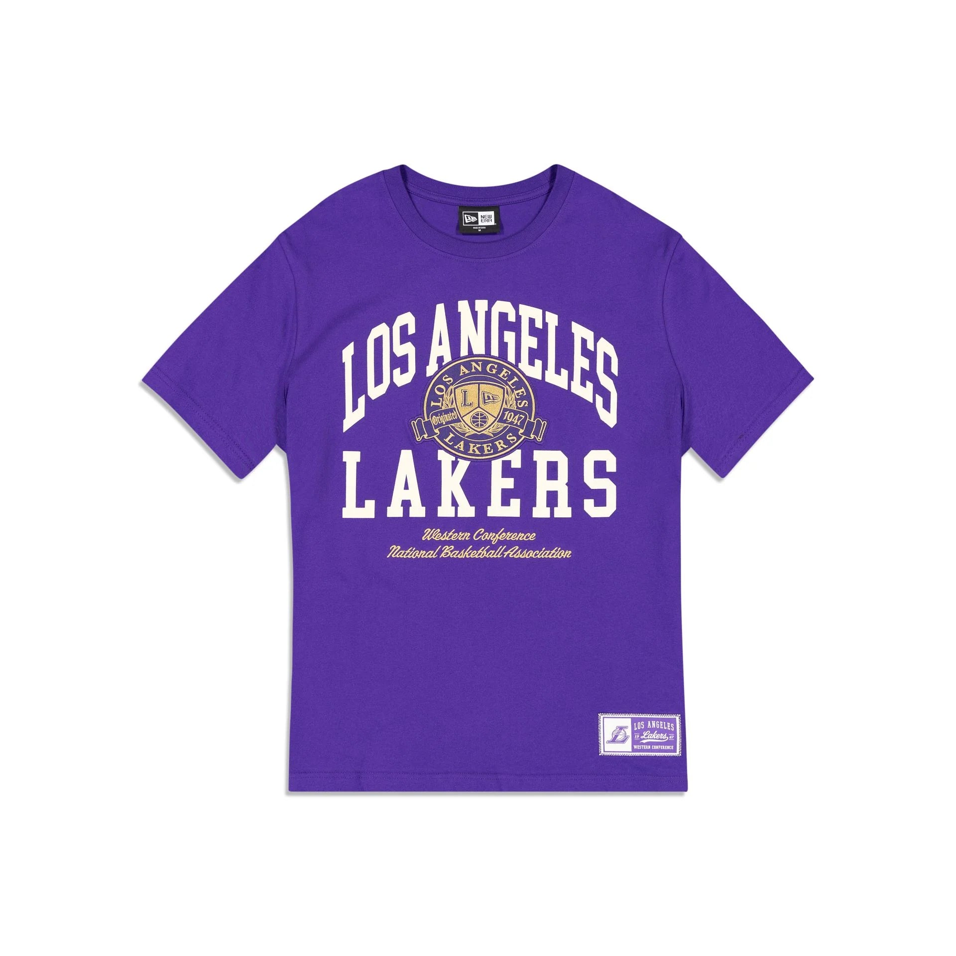 The "New Era Los Angeles Lakers Letterman Classic T-Shirt" likely represents a collaboration between New Era, known for its headwear, and the Los Angeles Lakers, a professional basketball team.