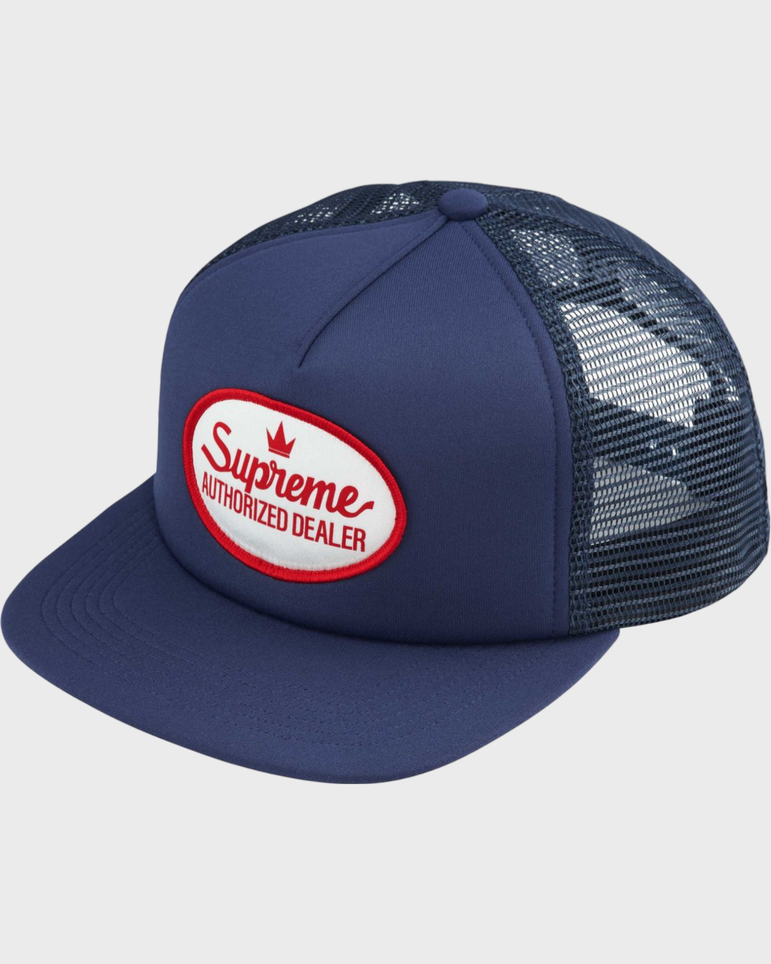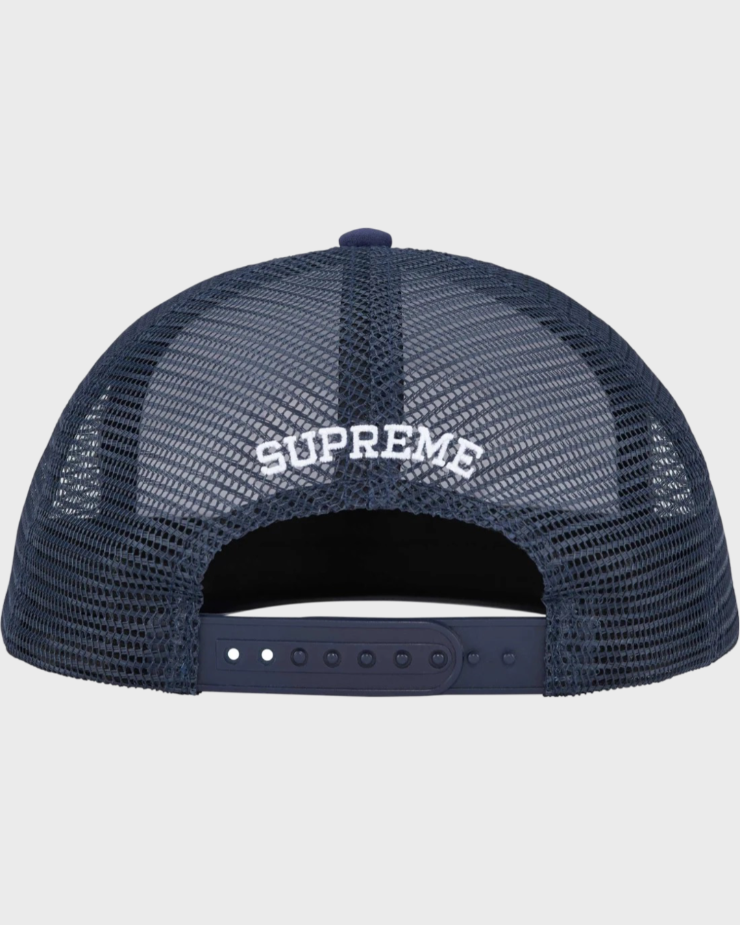 Poly 5-Panel hat with mesh back and snap closure. Printed logo patch on front and embroidered logo on back.