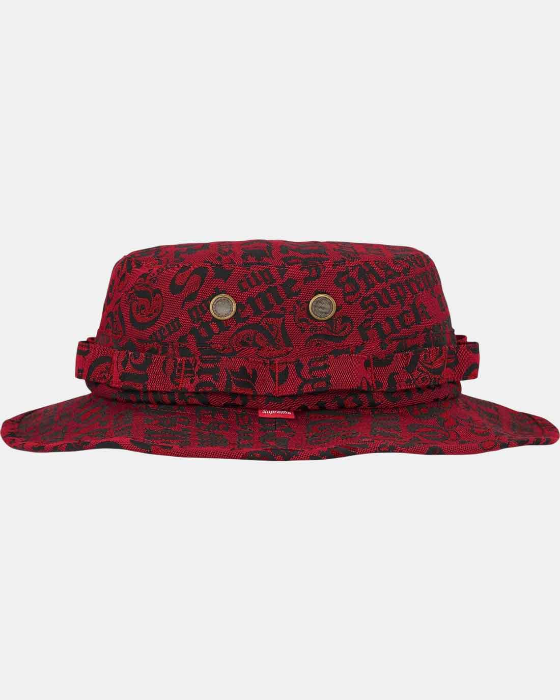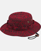 Poly blend boonie with jacquard woven pattern, cotton cord closure and leather cord stopper.