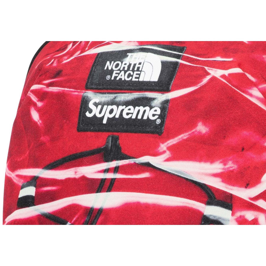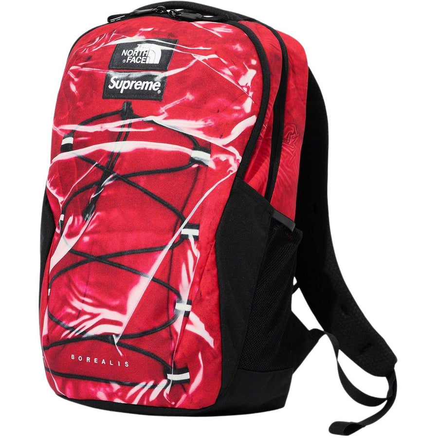 Water resistant recycled poly with trompe l’oeil printed graphic and embossed logo lining. Main zip compartment with single layer laptop sleeve. Front zip compartment with zip and organizer pockets. Elastic mesh water bottle pockets at sides. Padded back panel and adjustable straps with buckle closure. Printed logos at front. 28L.