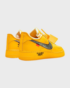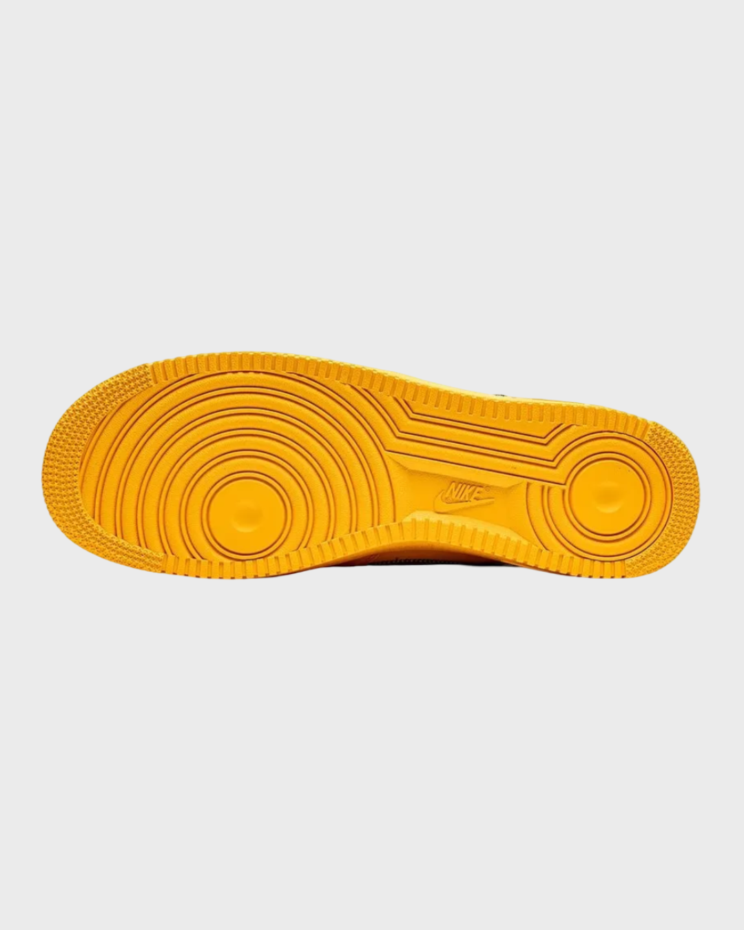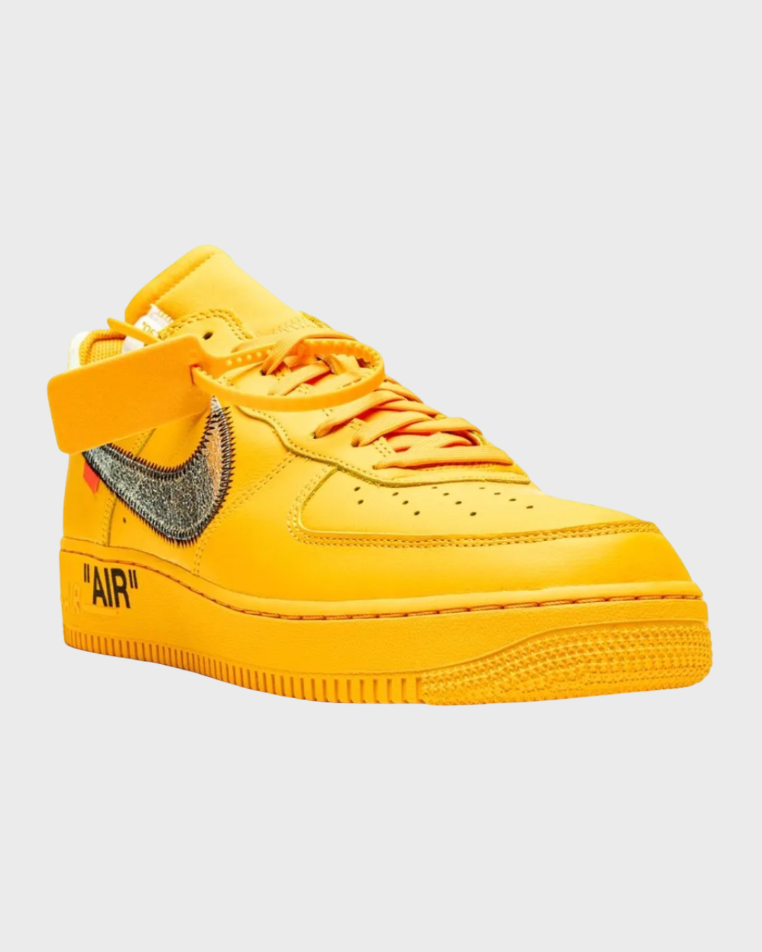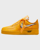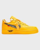 Bold, bright, and unmistakably Off-White™, the AF1 "Lemonade" merges Virgil Abloh’s industrial design language with Nike’s iconic Air Force 1 silhouette. The shoe features a vibrant University Gold leather upper, contrasted by a metallic silver Swoosh that’s stitched on with exposed zigzag threading. Off-White’s signature Helvetica text is printed on the medial side, while a small orange tab adds a subtle pop of contrast to the Swoosh.