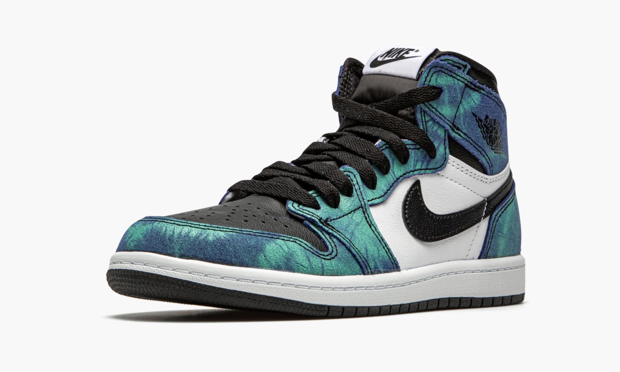The Women’s Air Jordan 1 High “Tie-Dye” is the women’s sizing of the summer-ready design of Michael Jordan’s first signature shoe. Released in Summer 2020, this lively colorway displays a tropical aesthetic with blue and green tie-dye leather overlays on the forefoot, collar, and heel. Black leather appears on the perforated toe box and white leather covers the mid-panel. Additional design elements include black leather Swooshes on each side, a black Wings logo on the collar, and a black nylon tongue. A white midsole and black outsole finish off the look. Release date: June 26, 2020.