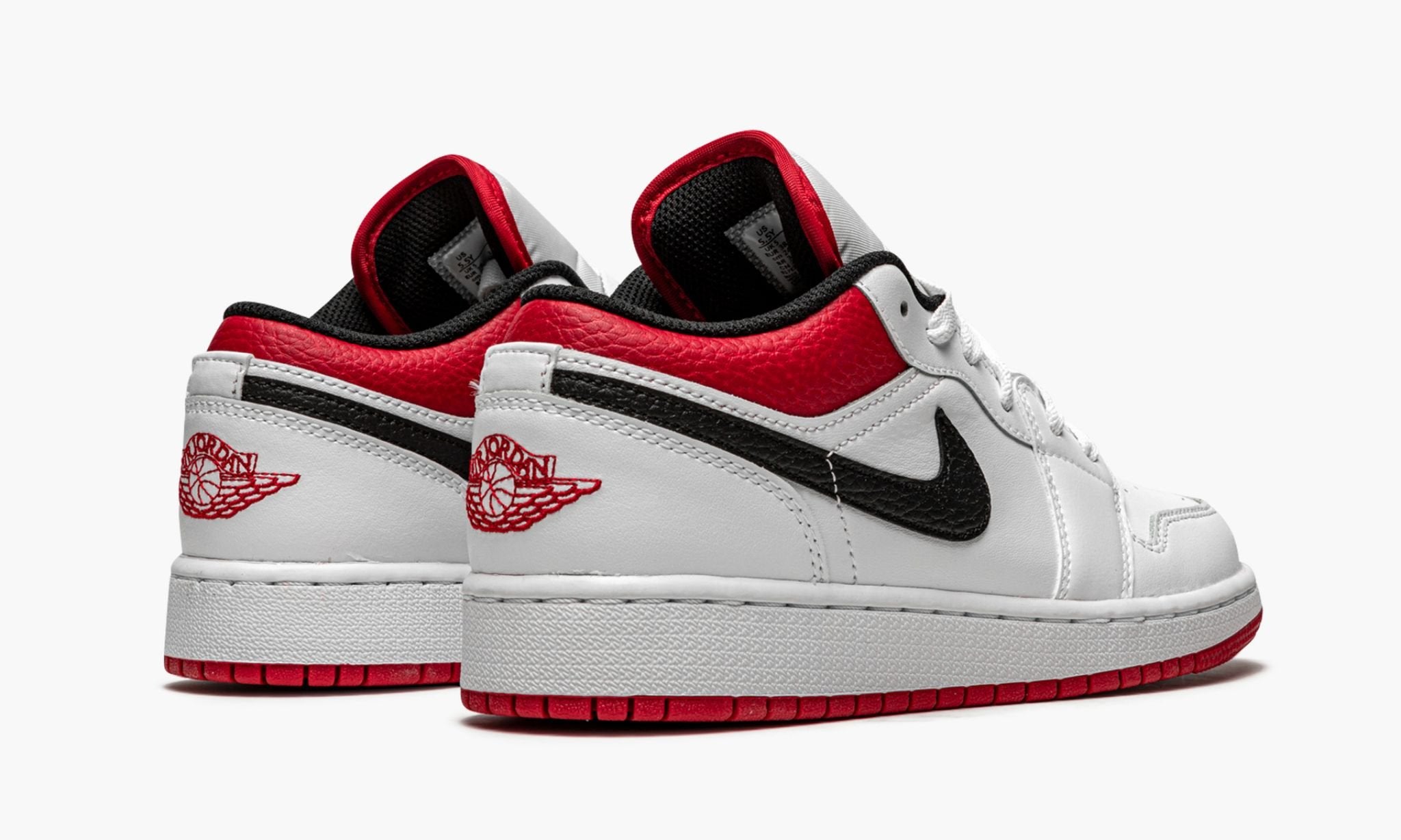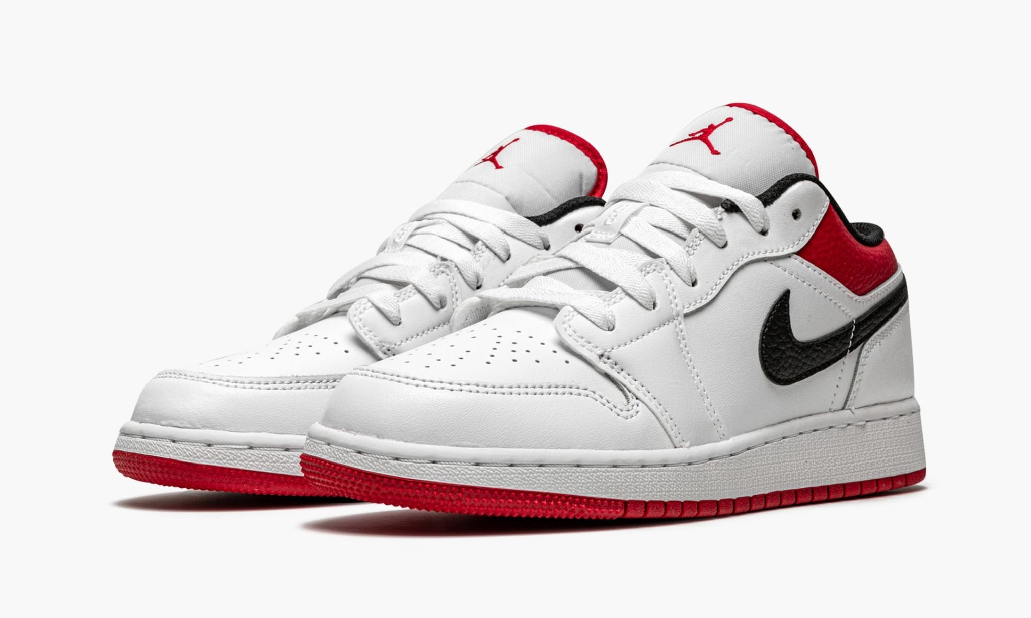 The Air Jordan 1 Low GS “White/Gym Red” is a youth edition of Michael Jordan’s first signature shoe in a Chicago Bulls inspired makeup. At this point, it’s hard to keep track of all the great Jordans that have been cast in the Bulls’ red, black, and white, team uniform colors. Add another to the collection in this “White/Gym Red” makeup on the alternate Jordan 1 Low. A black tumbled leather Swoosh and Gym Red leather collar contrast the white leather base. A fiery red embroidered “Wings” logo is stitched onto the heel. A Gym Red Jumpman appears on the top of the white nylon tongue. Tonal embroidered “23” branding, a reference to Michael Jordan’s jersey number with the Bulls, graces the white lace loop overlay on the tongue. The white midsole and Gym Red outsole round out the look.