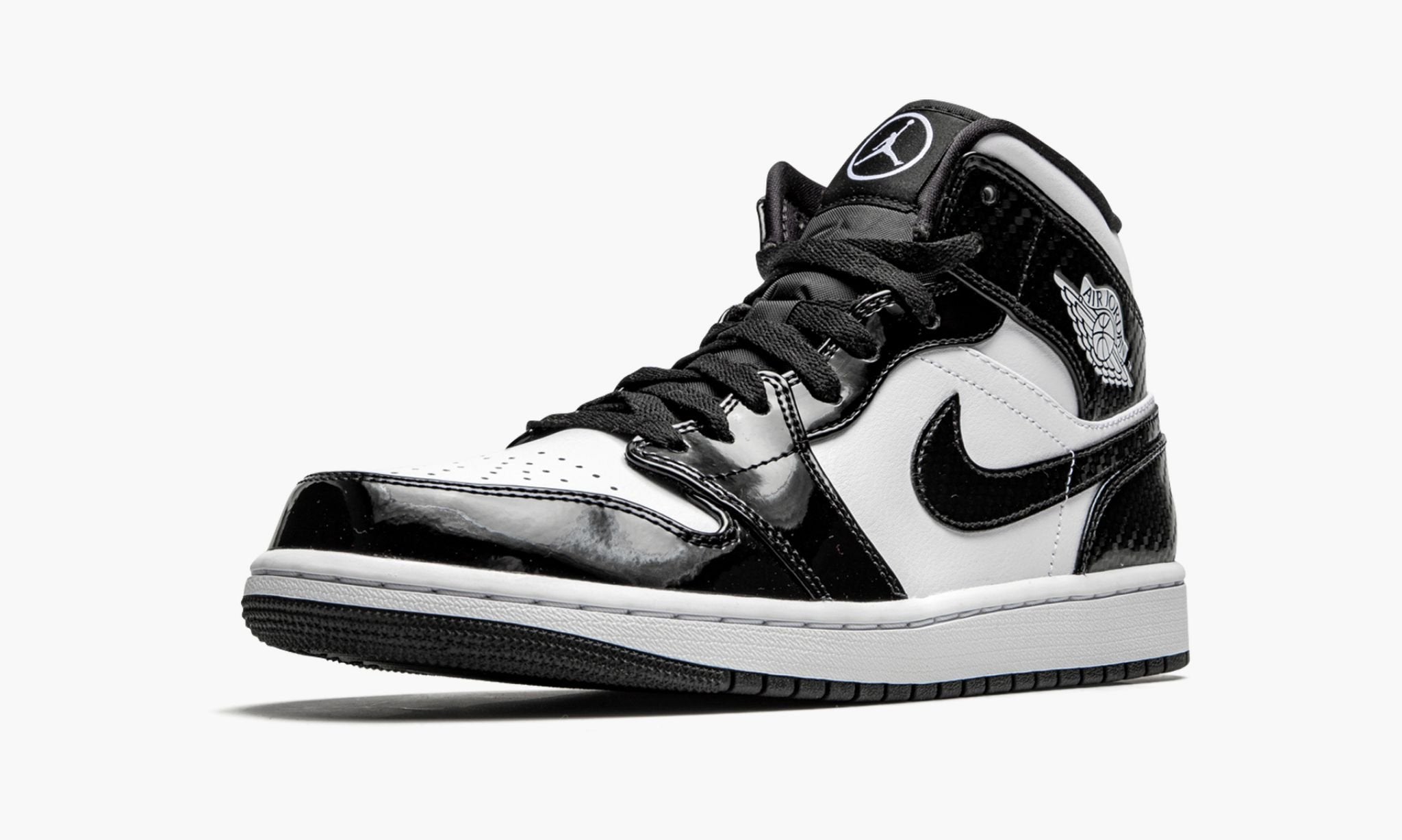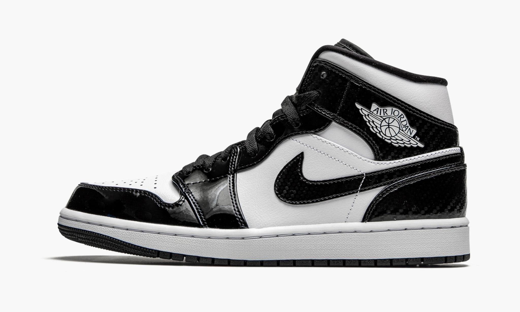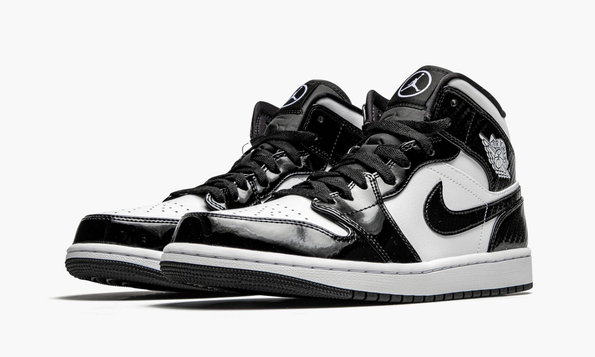 The Air Jordan 1 Mid SE GS “All-Star Weekend 2021” is the youth sizing of Michael Jordan’s first signature shoe that salutes the NBA’s annual All-Star Weekend festivities. Dressed in what could be best described as a very Air Jordan 11 “Concord” like black and white color scheme, the Jordan 1 Mid “All-Star Weekend 2021” is a classic design for kids. Overtures to the previously mentioned “Concord” makeup include the black patent leather overlays on the forefoot, toe cap, eyelets, collar, and heel. The perforated toe, mid-panel, and collar display a smooth white leather construction that contrasts with the aforementioned glossy black overlays. The black Swooshes as well as the heel and collar panels are given a carbon-fiber-like texture, which seems to be a further nod to the Jordan 11. A circular Jumpman emblem is printed on the black nylon tongue tag to denote the special All-Star Weekend theme. Release date: February 2021.