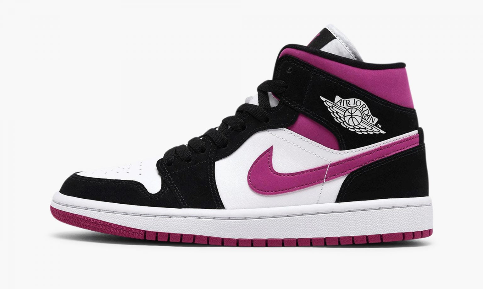 The Women’s Air Jordan 1 Mid “Magenta” is an intriguing look for Michael Jordan’s iconic first signature shoe fitted in women’s sizing. The alternate mid-top design of the Jordan 1 continues to explore off court looks, and the “Magenta” colorway is one of the most colorful options in the collection. The upper features white leather on the perforated toe and mid-panel. Contrasting black nubuck overlays appear on the eyelets, forefoot, collar overlay, and heel. Eye-pleasing Magenta accenting can be found on the leather Swoosh, collar, and Jumpman detailing on the black nylon tongue tag. A white “Wings” logo is located on the collar. The look is rounded together by a white rubber midsole and magenta outsole.
