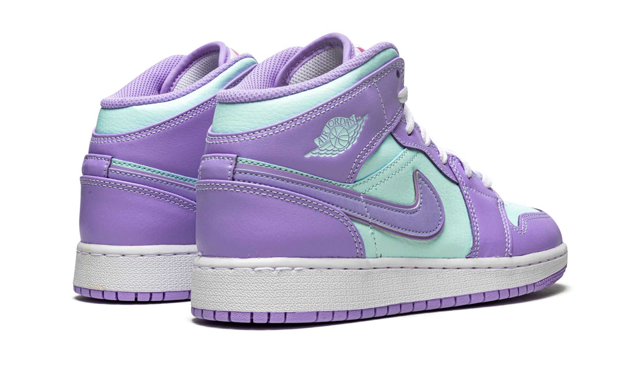 The Air Jordan 1 Mid GS “Purple Pulse/Arctic Punch” is a youth version of Michael Jordan’s first signature shoe in an Easter inspired colorway. The “Purple Pulse/Arctic Punch” references the pastel colors associated with the springtime holiday on its design, employing purple leather detailing on the forefoot, eyelets, collar, heel, and Swoosh. A light aqua leather base contrasts the look. Jordan Brand places an Arctic Punch “Wings” logo on the collar and a pink Jumpman on the tongue tag. A white nylon tongue, white shoe laces, and purple mesh sock liner add to the calming colorway. The white midsole and contrasting purple outsole complete the look of this head-turning Air Jordan 1 Mid for kids.