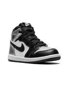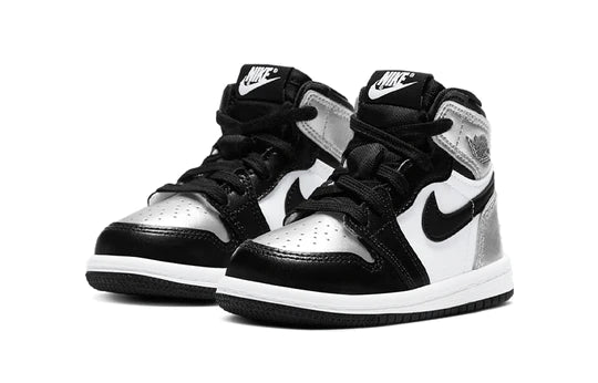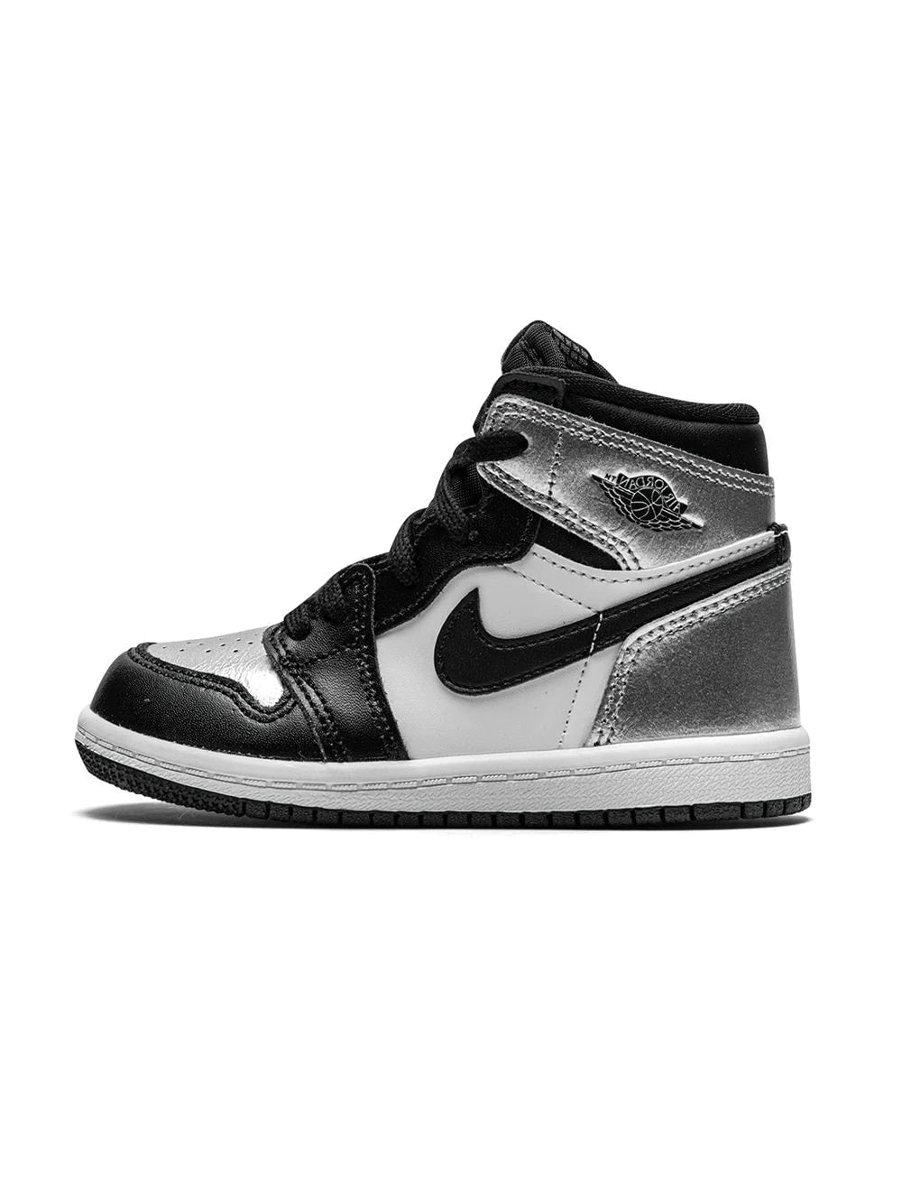 The Air Jordan 1 High TD “Silver Toe” is the preschool sizing of Michael Jordan’s first signature shoe in a colorway that salutes a popular non-original style of the shoe. Released in February 2021, the “Silver Toe” draws favorably from Kawhi Leonard’s rare “Think 16” design that was released in limited quantities in 2018 as an homage to the San Antonio Spurs’ 2014 NBA Championship victory. Here, the look features similarly flashy silver metallic detailing on the back of the shoe and on the collar. A slightly less bright variation of the material can be found on the perforated toe. Contrasting black leather overlays on the forefoot, eyelets, collar, and on the Swoosh branding on either side of the shoe balance out the look. Additional branding appears in the form of a black “Wings” logo on the collar and white “Nike” detailing on the top of the black nylon tongue. The “Silver Toe” was originally released in full family sizing on February 19, 2021.