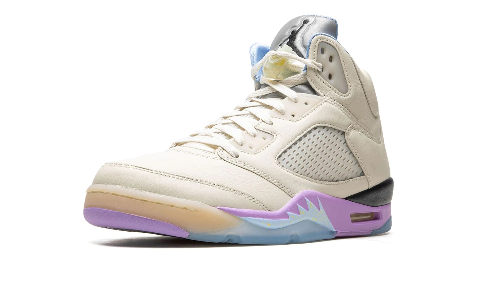 The DJ Khaled x Air Jordan 5 “We the Best - Sail” is one of several popular colorways included in the special collaboration by the famous hip-hop producer on Michael Jordan’s fifth signature shoe. DJ Khaled’s collection of pastel-colored Jordan 5s is inspired by Miami and warm weather, as the shoe’s colorful accents undoubtedly call to mind both the Florida city and its climate. The shoe is complete with a Sail-colored leather construction with translucent netting on the tongue and mid-panel. Yellow “We the Best” branding inspired by Khaled’s signature catchphrase is embroidered on the heel of the left shoe while the Jordan 5’s original “Nike Air” logo is embroidered on the heel of the right shoe. The words “Keep” and “Going” are found on the underside of the blue quilted tongue tag. Classic Jumpman logo detailing appears on the Metallic Silver reflective tongue. Release date: November 28, 2022