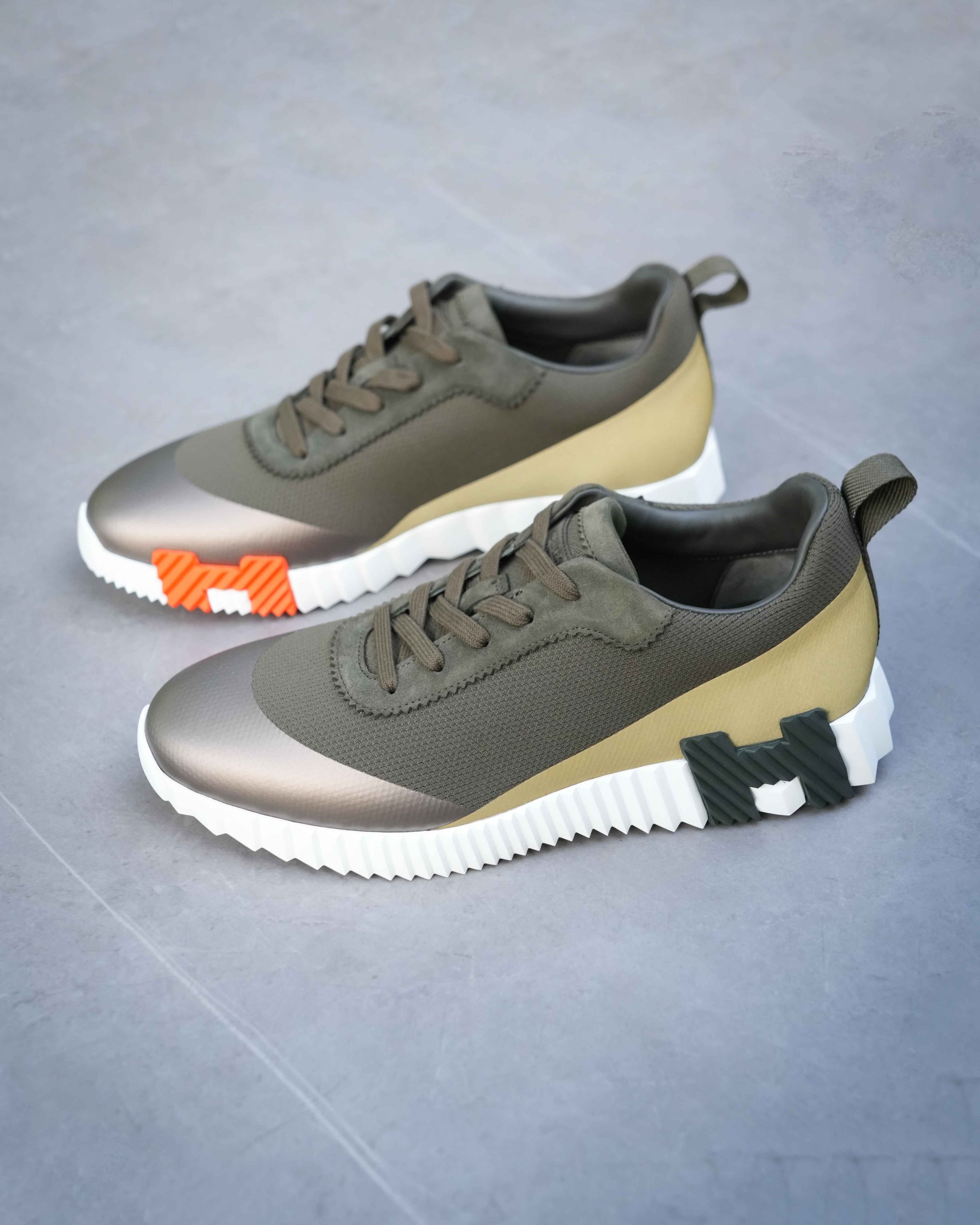 Showing a clean pair of heels, the Bouncing sneaker ventures into urban effervescence. So light that it no longer appears to touch the ground and full of untamed energy, it turns every moment into a high-speed adventure. Thinking big, it features a signature "H en biais" motif in a bold, oversized forma