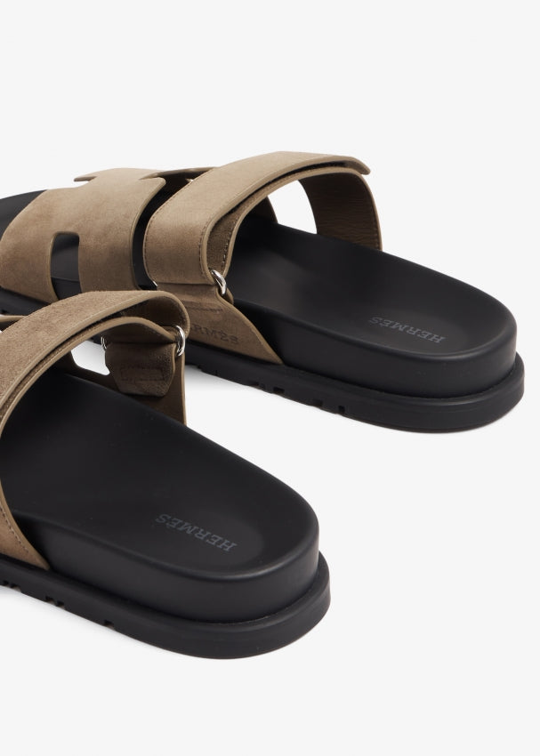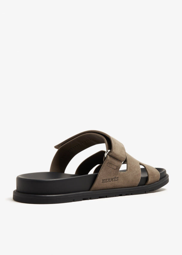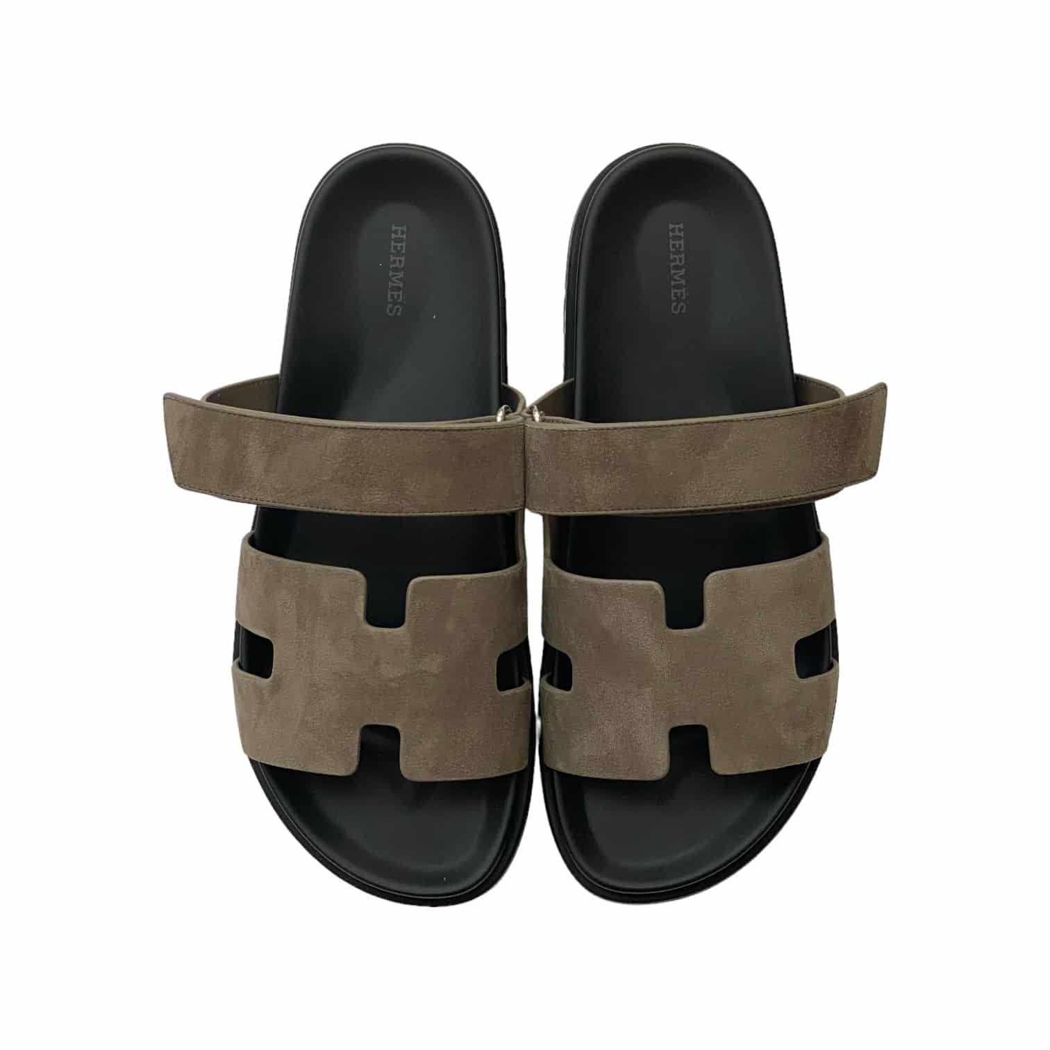 Hermes Chypre Sandal Etoupe Suede Goat Skin with anatomical rubber sole and adjustable strap.