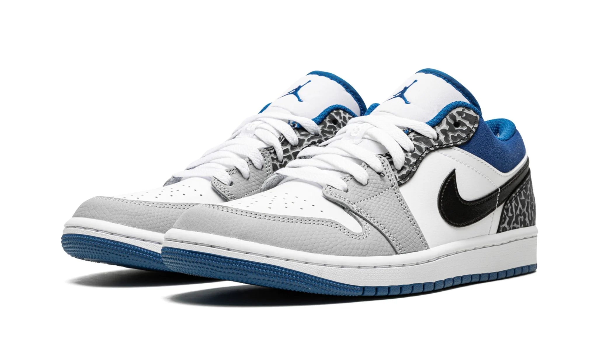 The Air Jordan 1 Low SE “True Blue” is a colorway of Michael Jordan’s first signature shoe that pays homage to the original Air Jordan 3 theme of the same name. A June 2022 release by Jordan Brand, the “True Blue” Jordan 1 Low SE features design elements and colors lifted from the Jordan 3 “True Blue” that was originally released in 1988. The perforated toe and mid-panel are designed in white leather. Contrasting light grey leather appears on the toe cap and forefoot. Classic elephant patterning is found on the upper eyelet panel and on the heel with blue “Wings” embroidery. A black leather Swoosh resides on the sides. A Dark Marina Blue Jumpman logo appears on the white leather tongue. Additional blue accenting comes into play on the suede collar and on the underside of the tongue. Release date: June 11, 2022