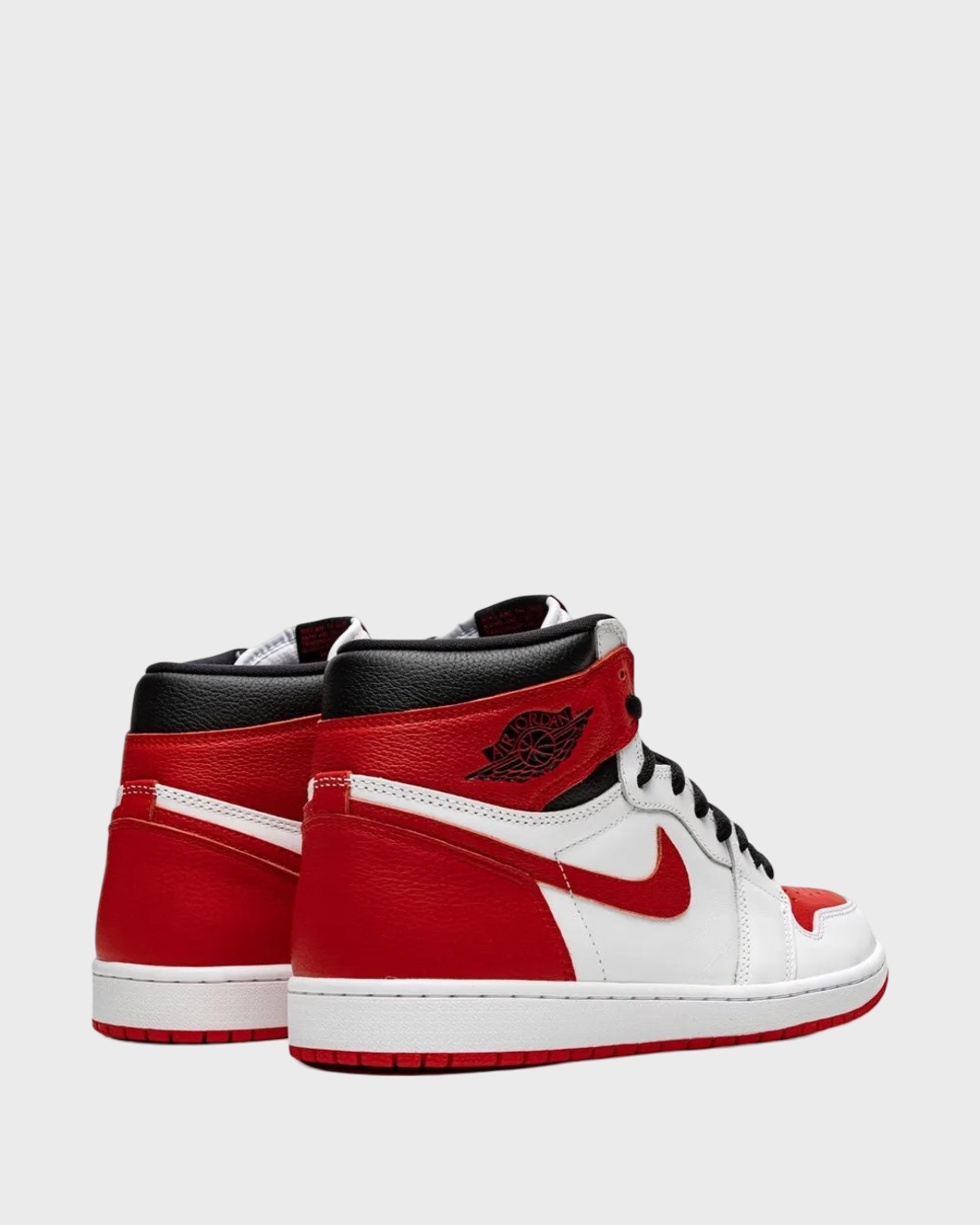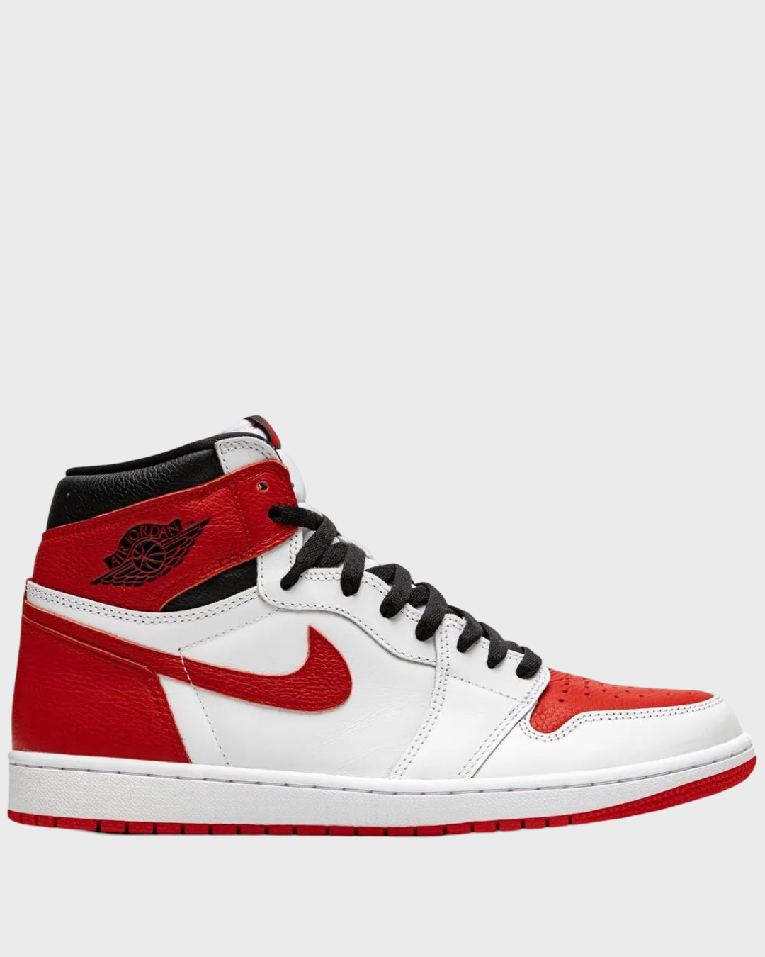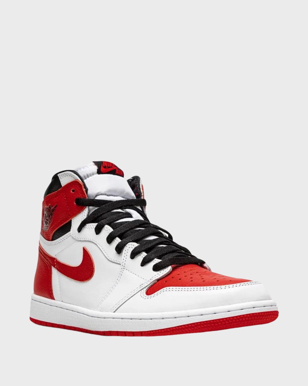 The Air Jordan 1 Retro High OG "Heritage" is a classic high-top sneaker inspired by Michael Jordan's original Chicago Bulls team colors. It features a white leather upper with University Red accents on the toebox, Swoosh, heel counter, and ankle flap. Black detailing appears on the ankle collar, Wings logo, and laces, completing the look with a white midsole and red outsole.
