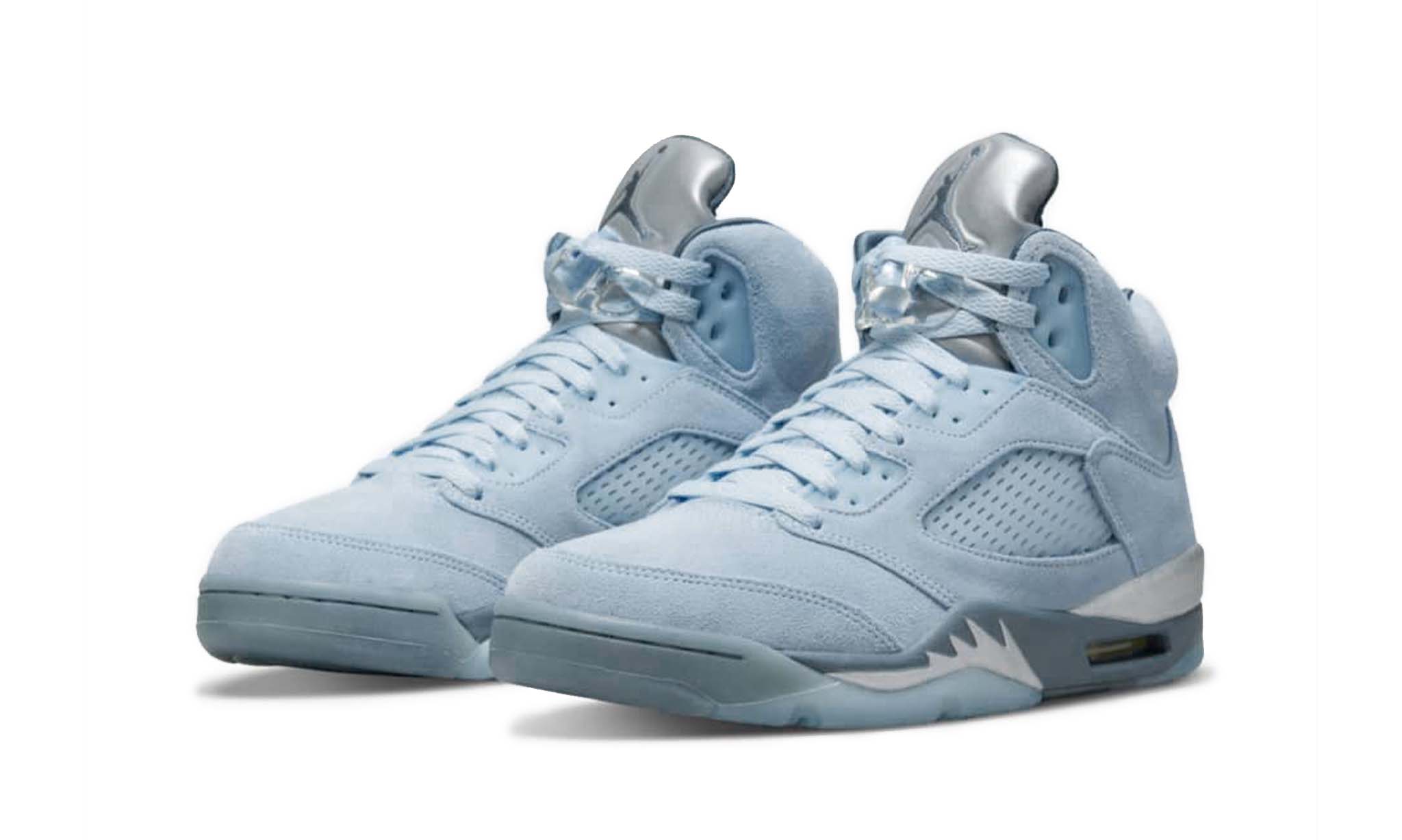 The Women’s Air Jordan 5 “Bluebird” is a women’s-only colorway of the vintage basketball shoe that was released in October 2021. The “Bluebird” variation of Michael Jordan’s fifth signature shoe treats the early ‘90s performance basketball design to a easy-on-the-eyes, monochromatic light blue makeover. Plush Bluebird-colored suede appears on the upper, save for the semi-translucent netting on the mid-panel and lower tongue. The laces and eyelets are designed in the same light blue hue. A grey Jumpman is embroidered on the heel and a blue Jumpman is found on the top of the reflective silver tongue. The clear lace lock and blue toggle are true-to-original design components of the Air Jordan 5. Silver shark tooth detailing is painted on the midsole. An icy blue outsole completes the look. Release date: October 7, 2021