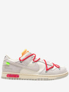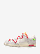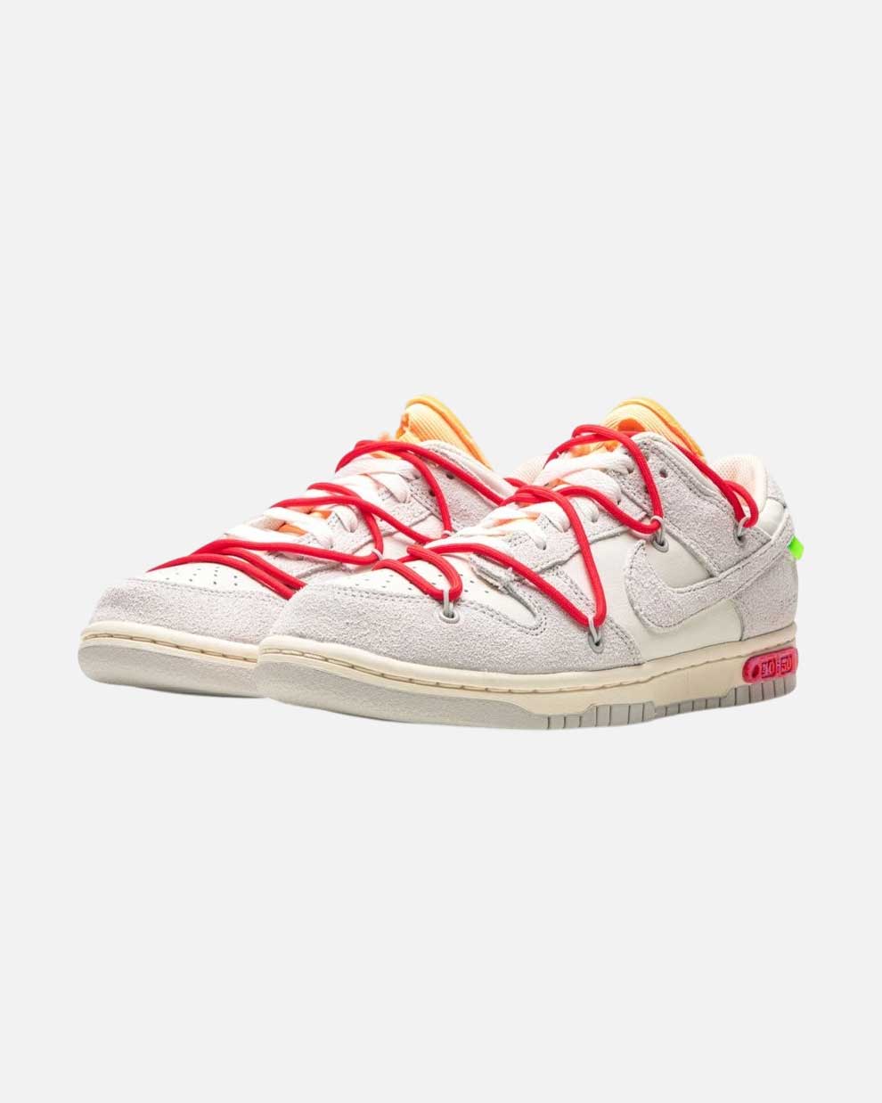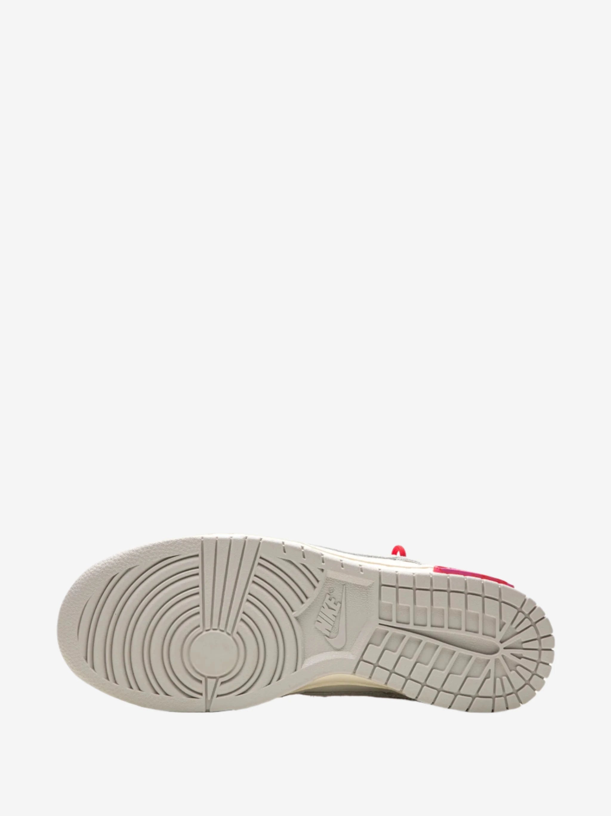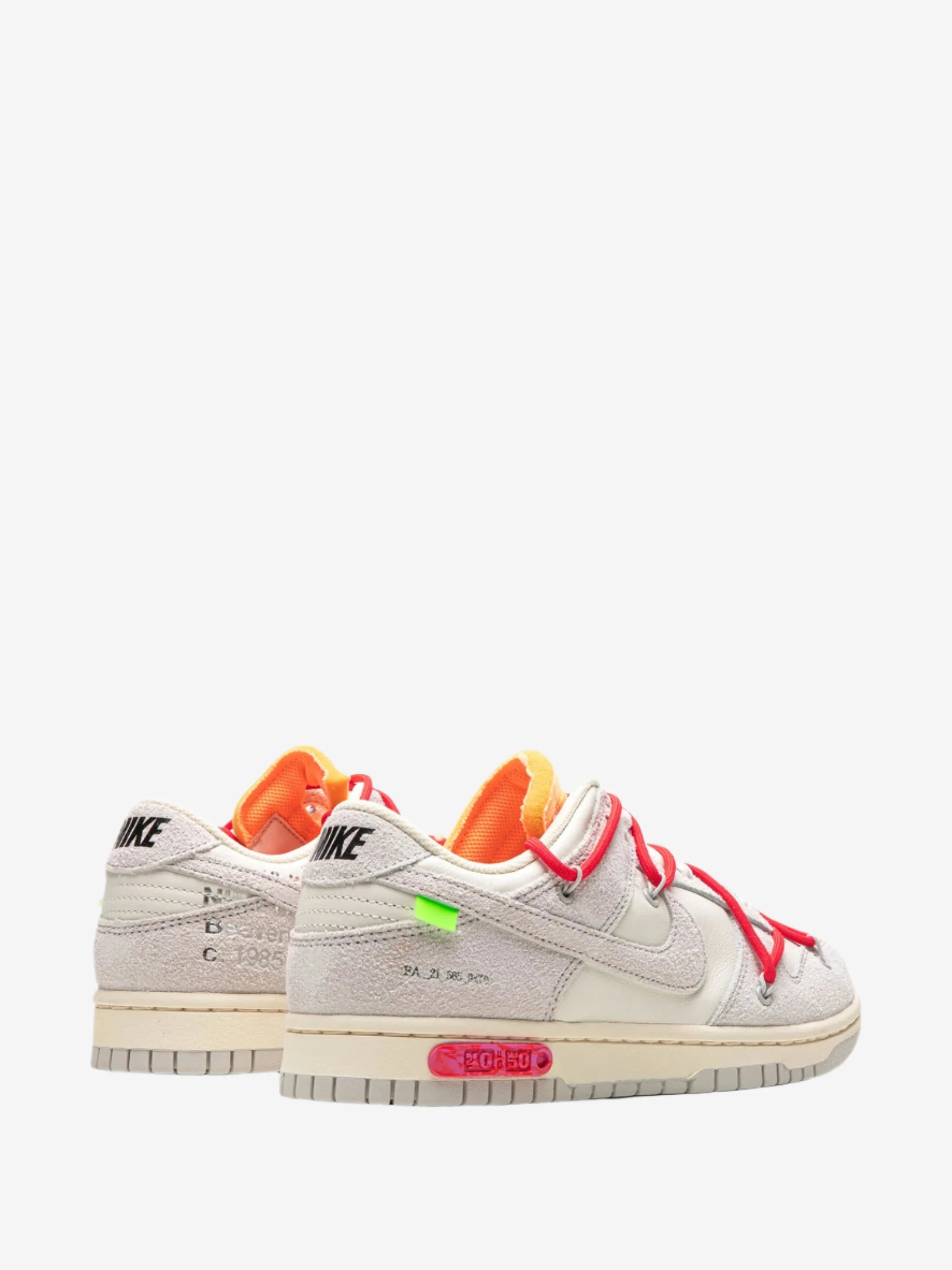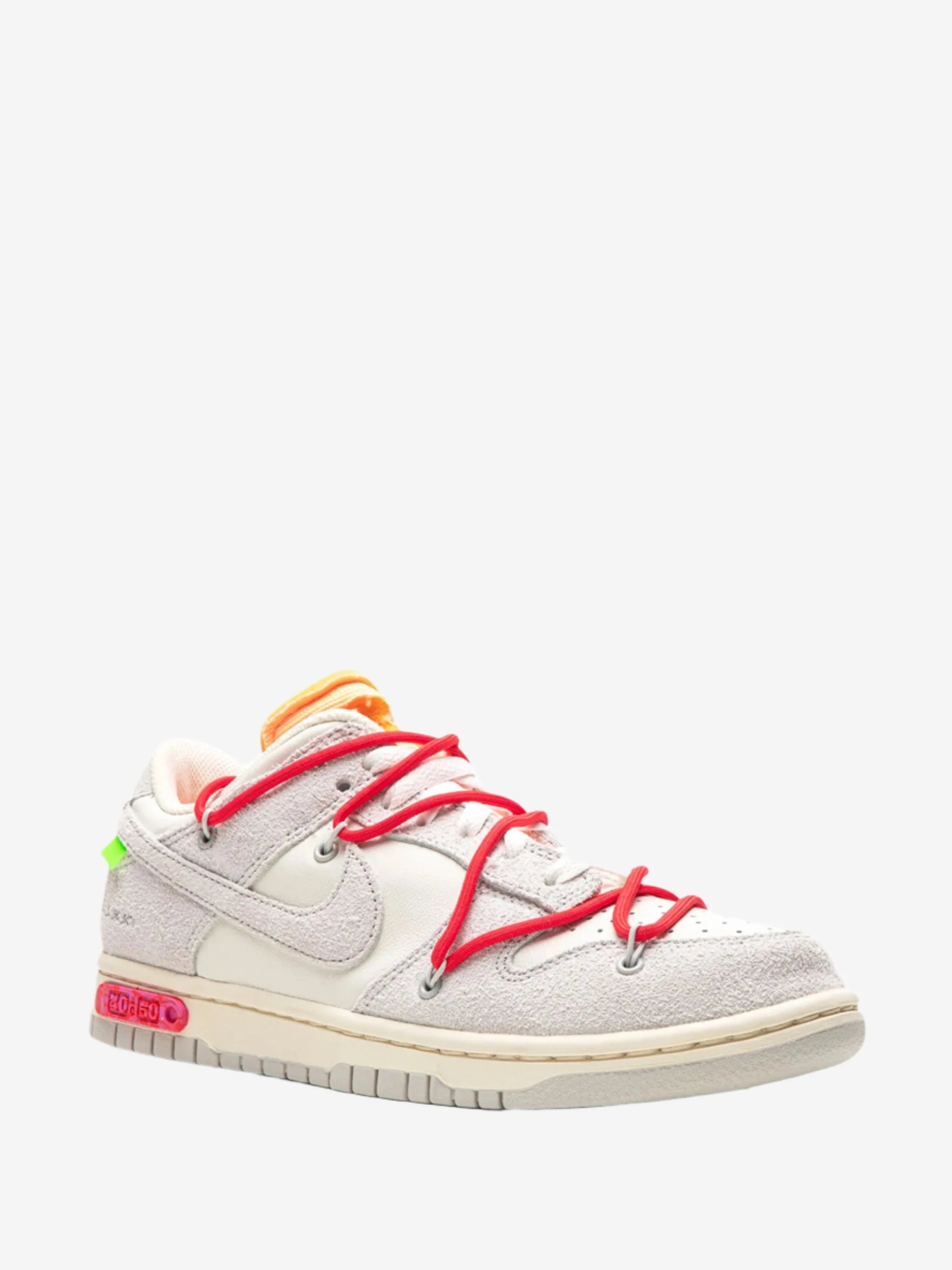 This Off-White x Nike Dunk Low is taken from the ‘Dear Summer’ collection, a sprawling follow-up to Virgil Abloh’s first Nike Dunk collaboration from 2019. The low-top makes use of a white leather upper with soft grey suede overlays, along with Virgil Abloh’s calling-card flourishes, which include a plastic zip tie and printed Helvetica text. Contrasting pops of color arrive via the sneaker’s secondary lacing system, zip-tie, an exposed-foam tongue and a rectangular tab affixed to the Swoosh. Limited to fifty pairs, a ’40 of 50’ badge is affixed on the lateral midsole.