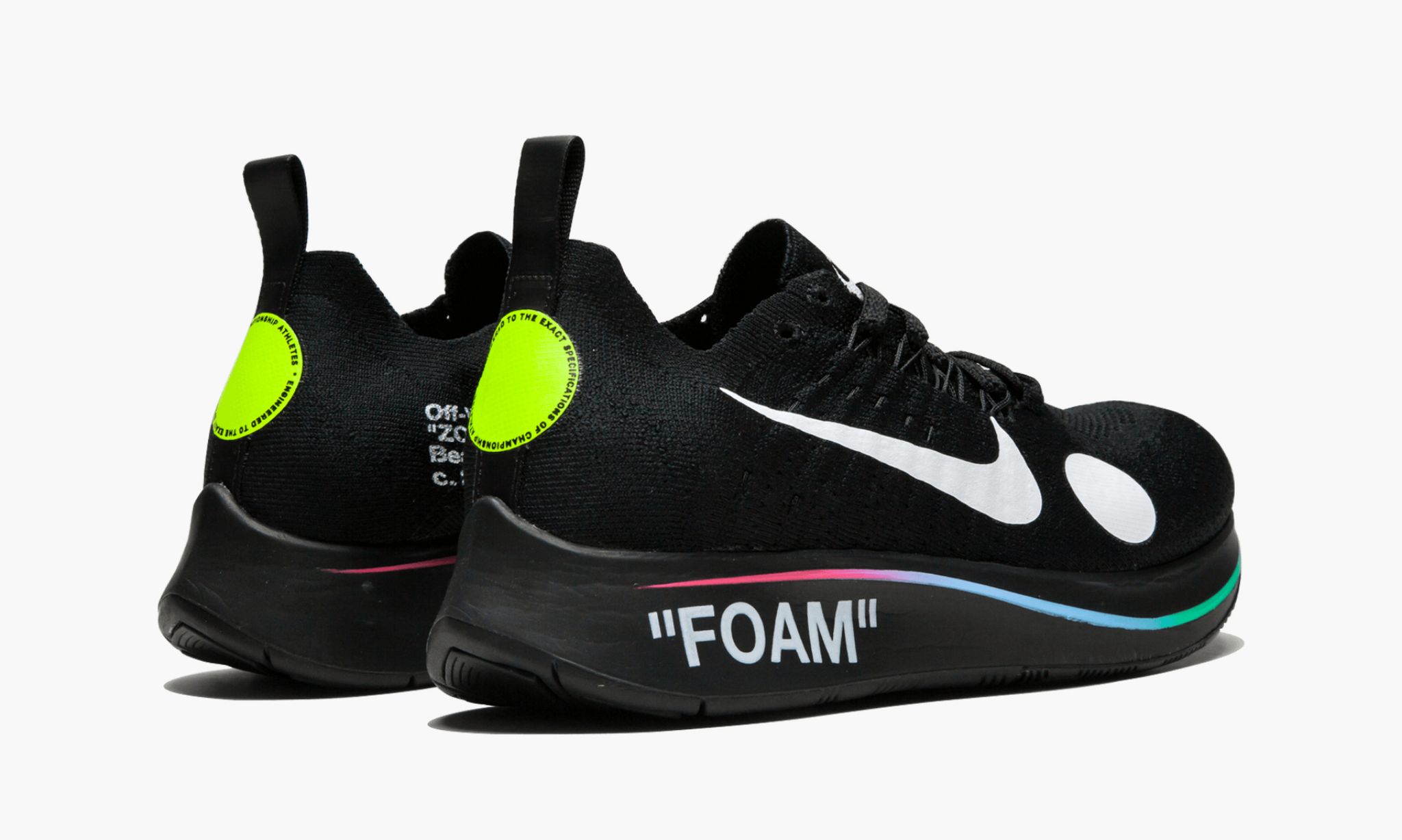 Virgil Abloh and Nike released the Zoom Fly Mercurial Flyknit in June 2018 to coincide with the start of the World Cup soccer tournament. The soccer-inspired silhouette features a Flyknit upper modeled after the Mercurial soccer boot series and a Zoom Fly running sole. Abloh designed the shoe with dots placed in common areas a soccer player kicks the ball. This Off-White x Nike Zoom Fly Mercurial "Black" is one of the two colorways the sneaker was released in.
